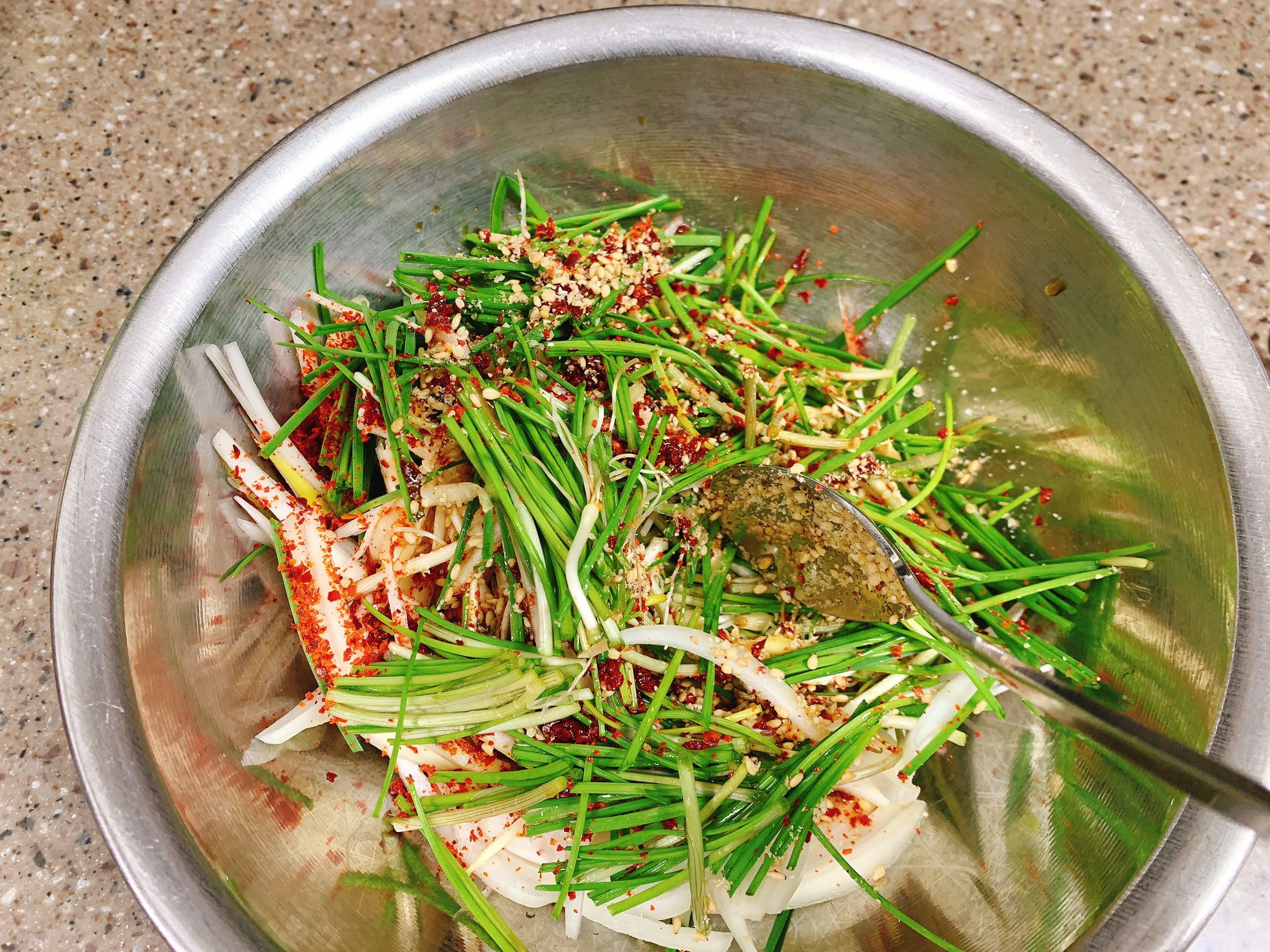 달래와 양파는 볼에 담고, 양념 재료를 하나씩 넣어요