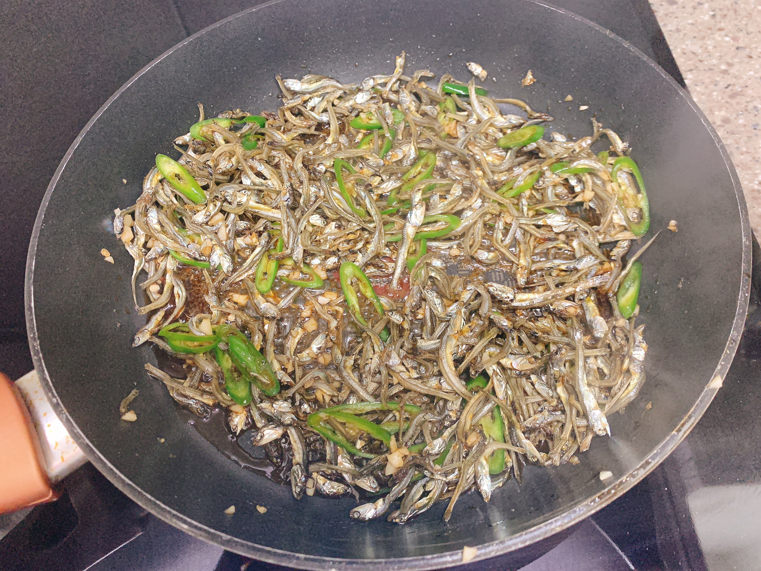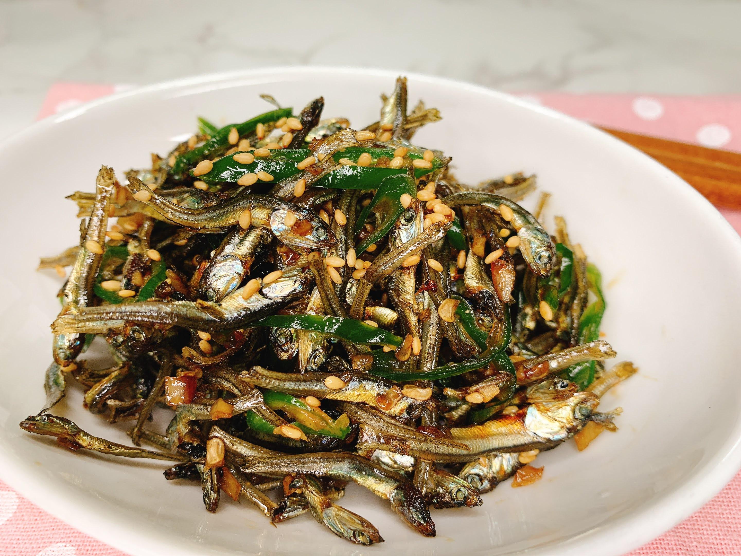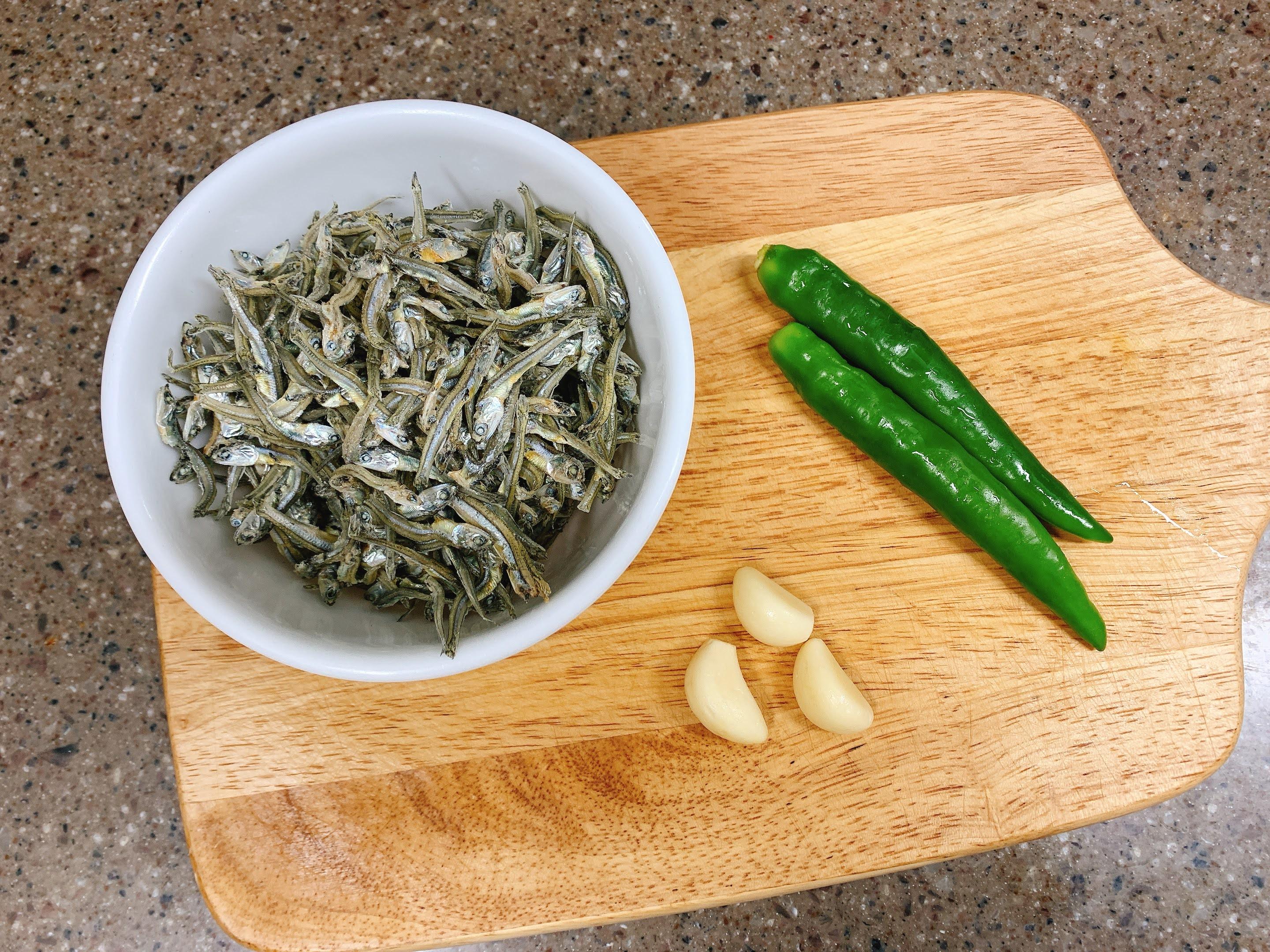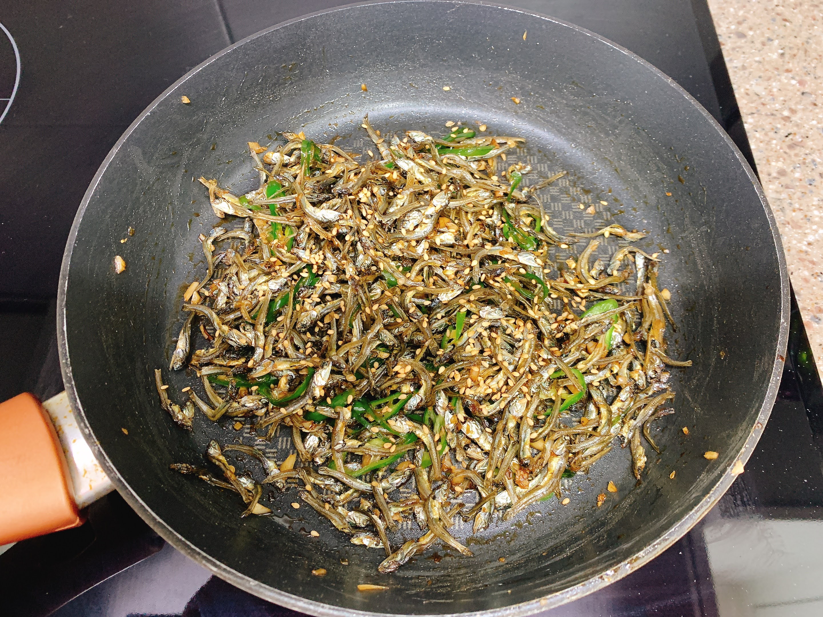 덖어둔 멸치와 청양고추, 다진마늘도 넣어
