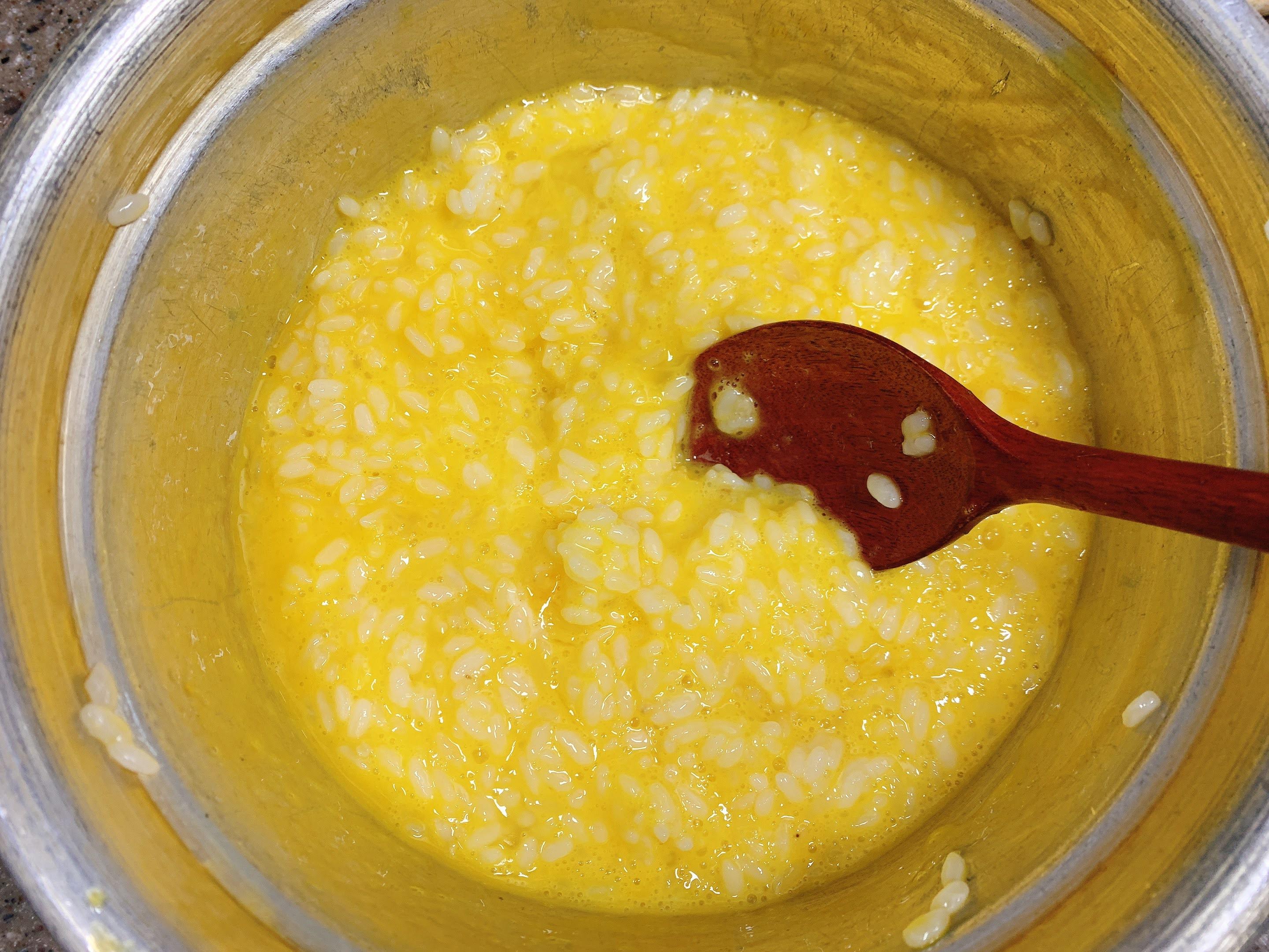 계란에 버무린 밥을 넣고 휘~ 저어가며
