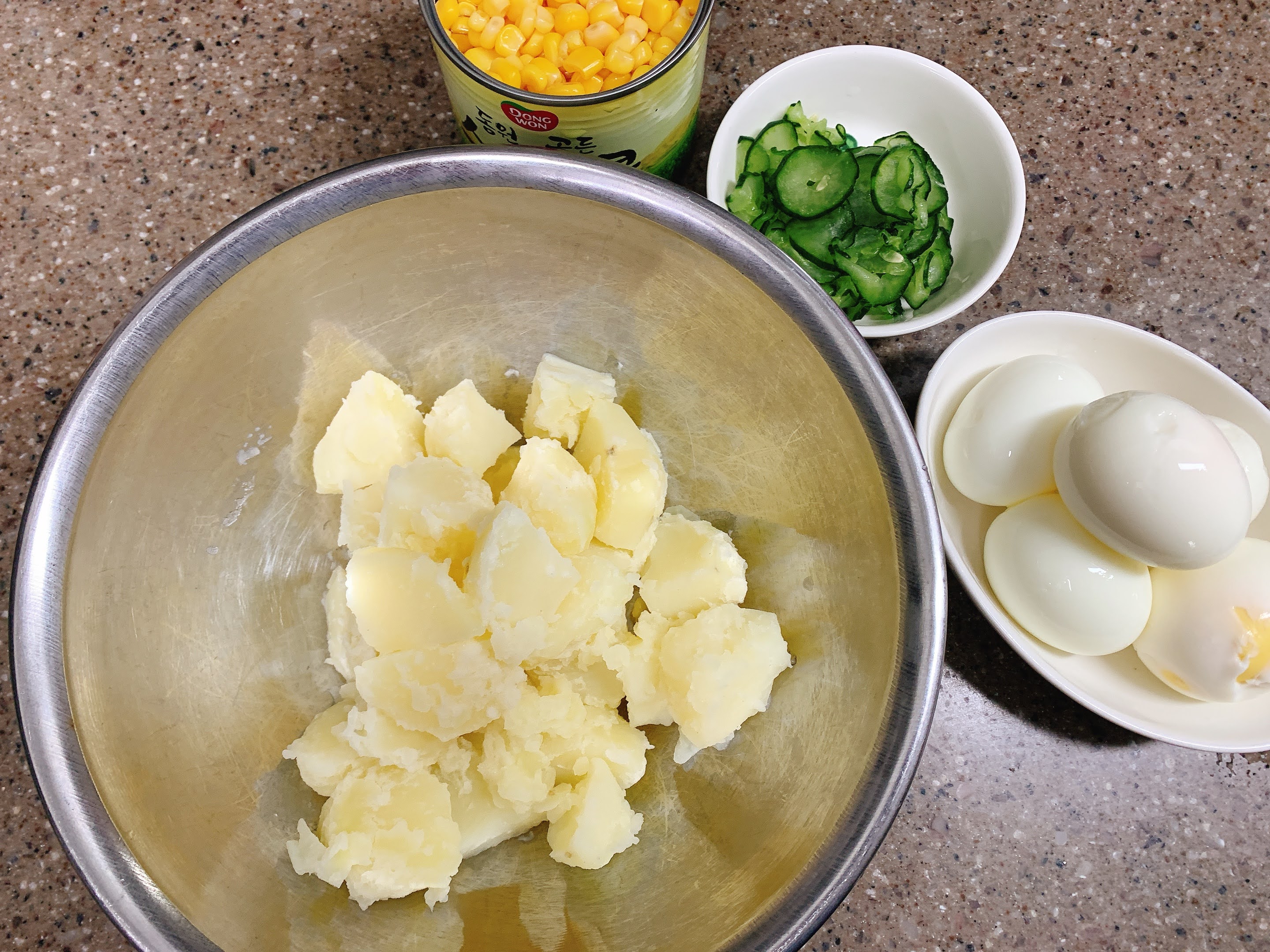 삶아진 감자는 으깨기 위해 큰볼에 옮기고,