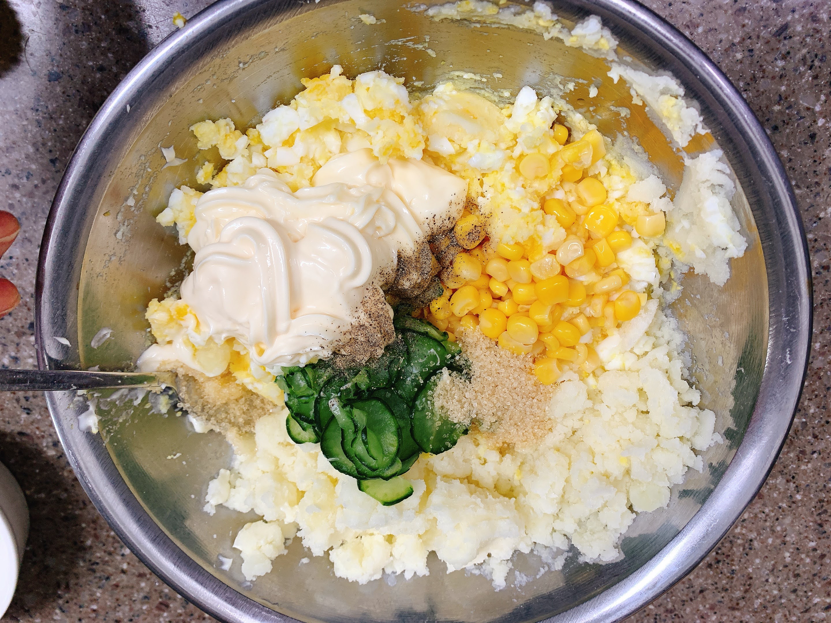 절였다 물기뺀 오이, 콘옥수수, 설탕 1스푼, 후추가루 ~