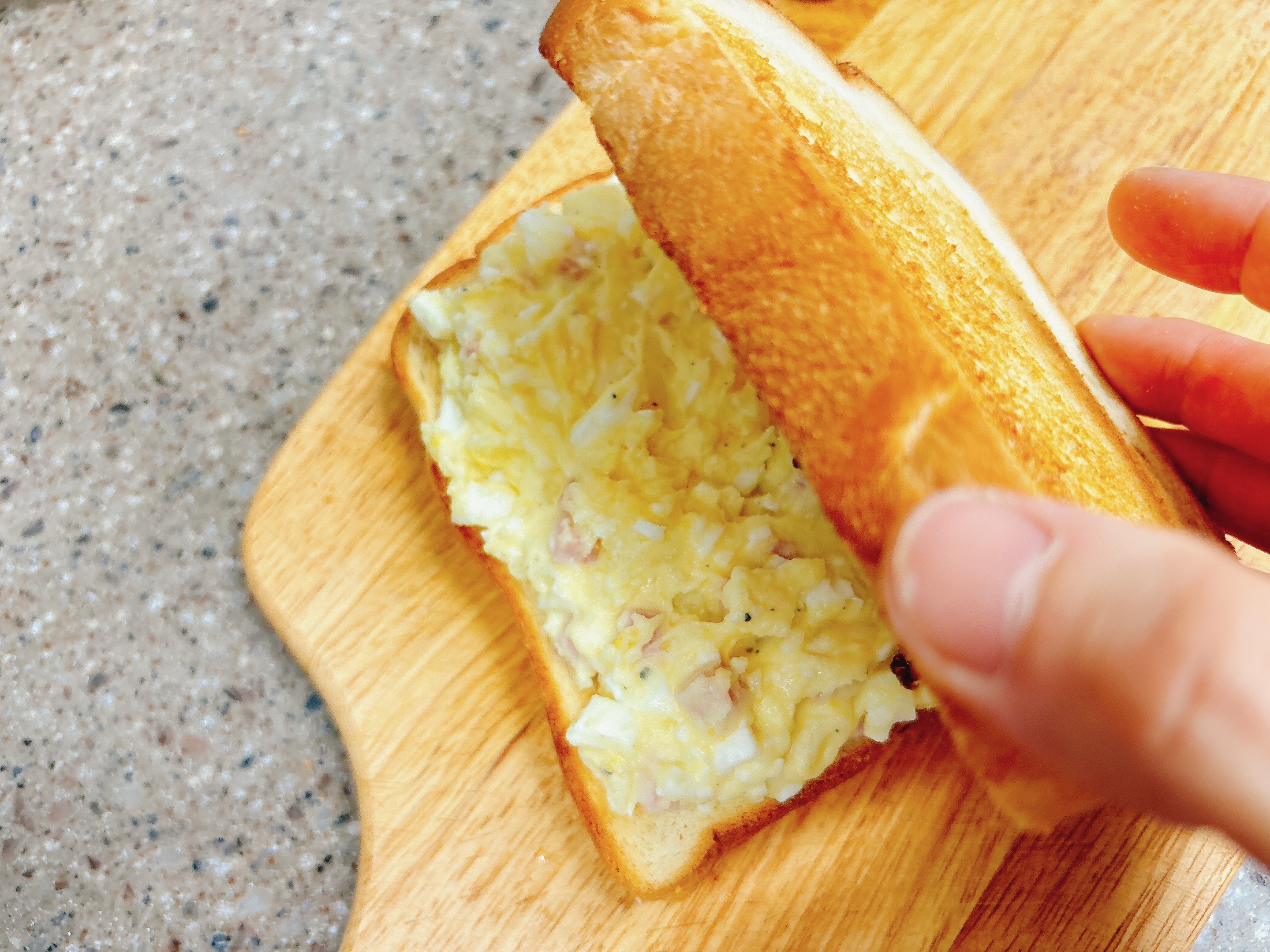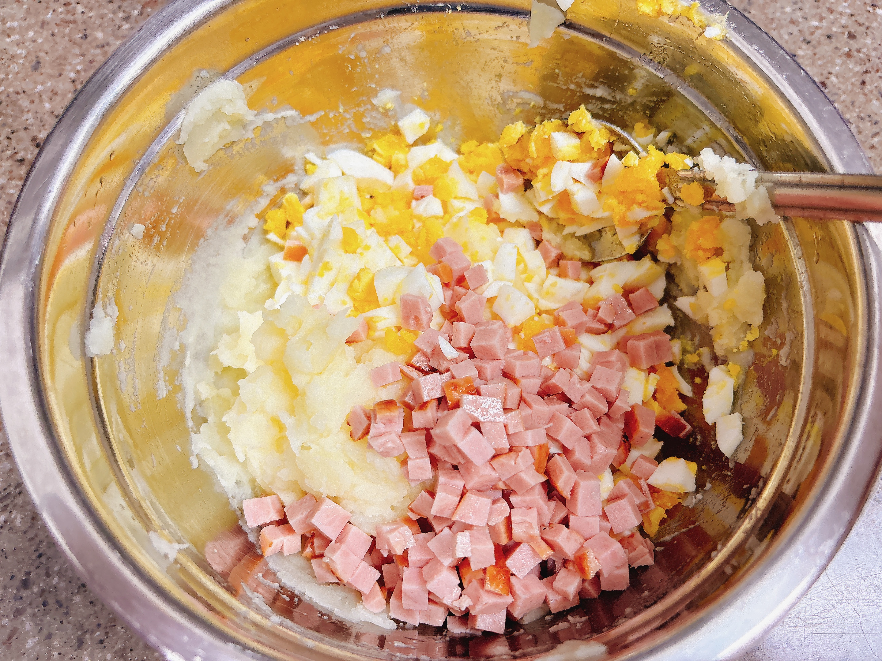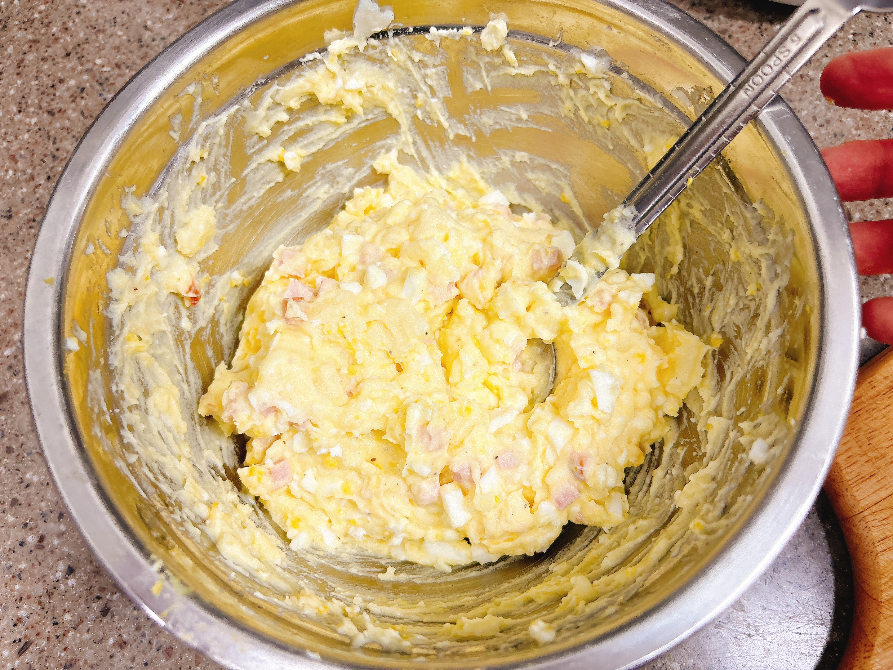 그위에 만들어둔 사라다를 넉넉히 올려편다음