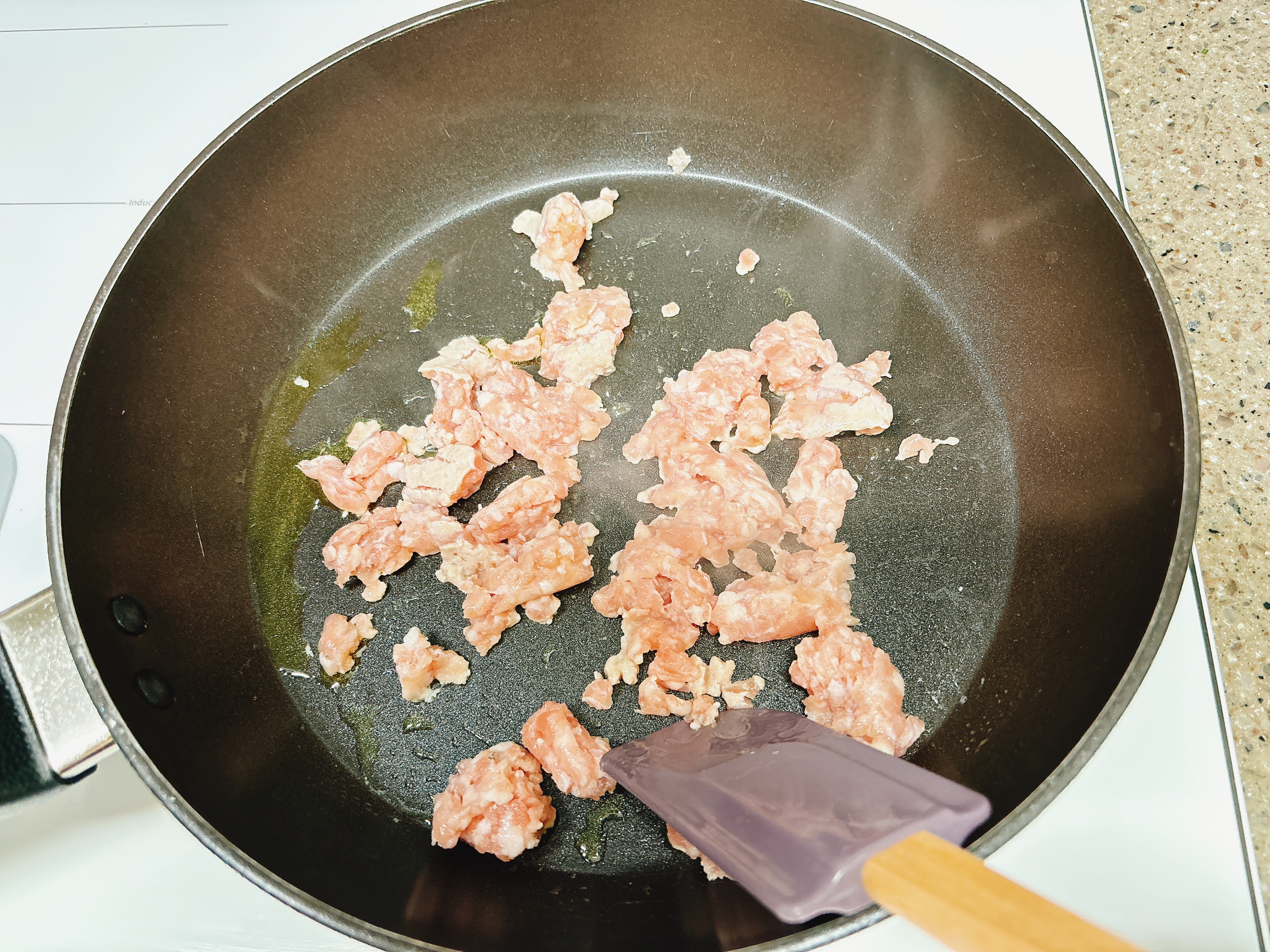 올리브유 두르고 돼지고기를 볶는데