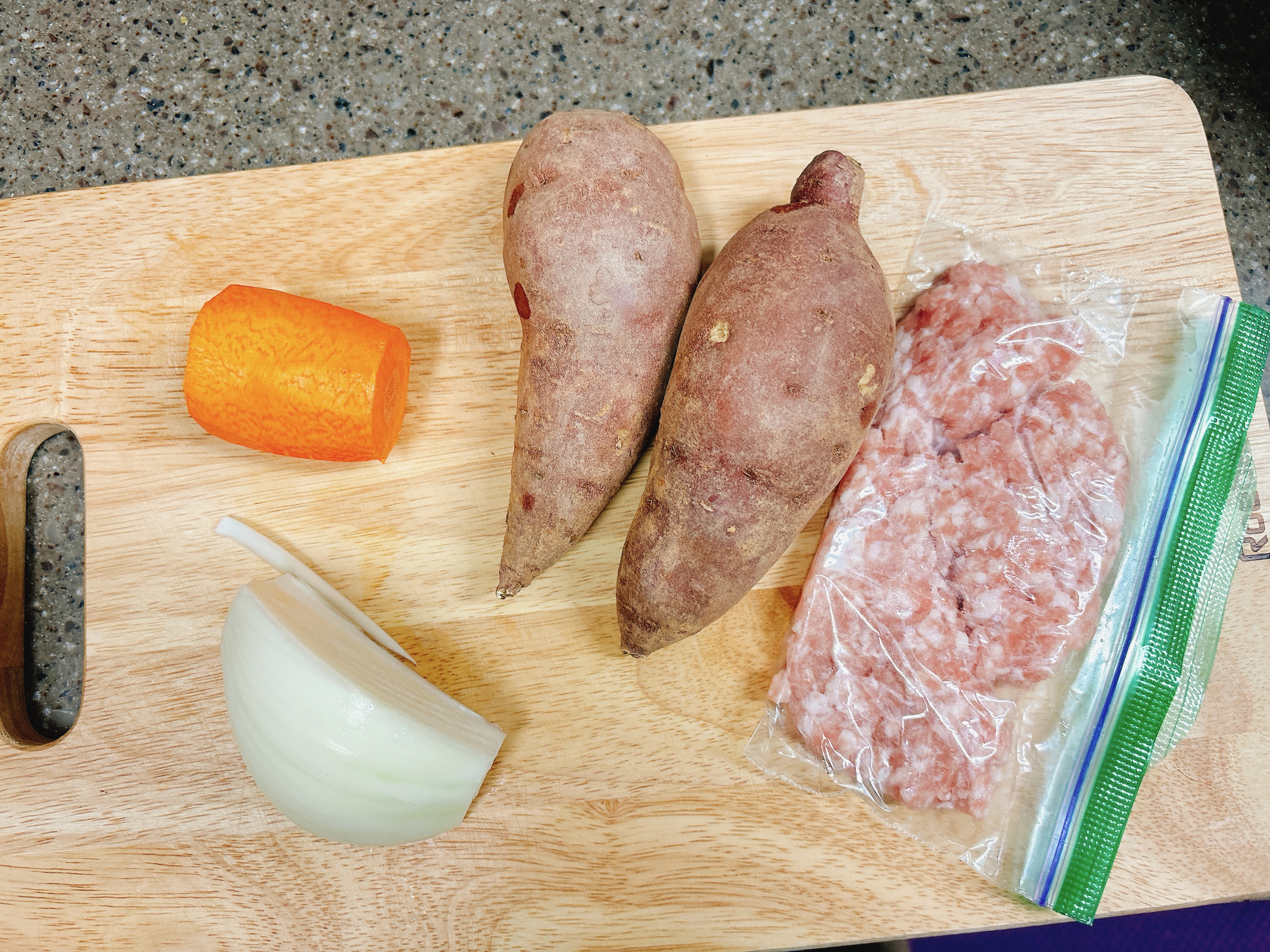갈은 돼지고기, 양파, 당근을 준비
