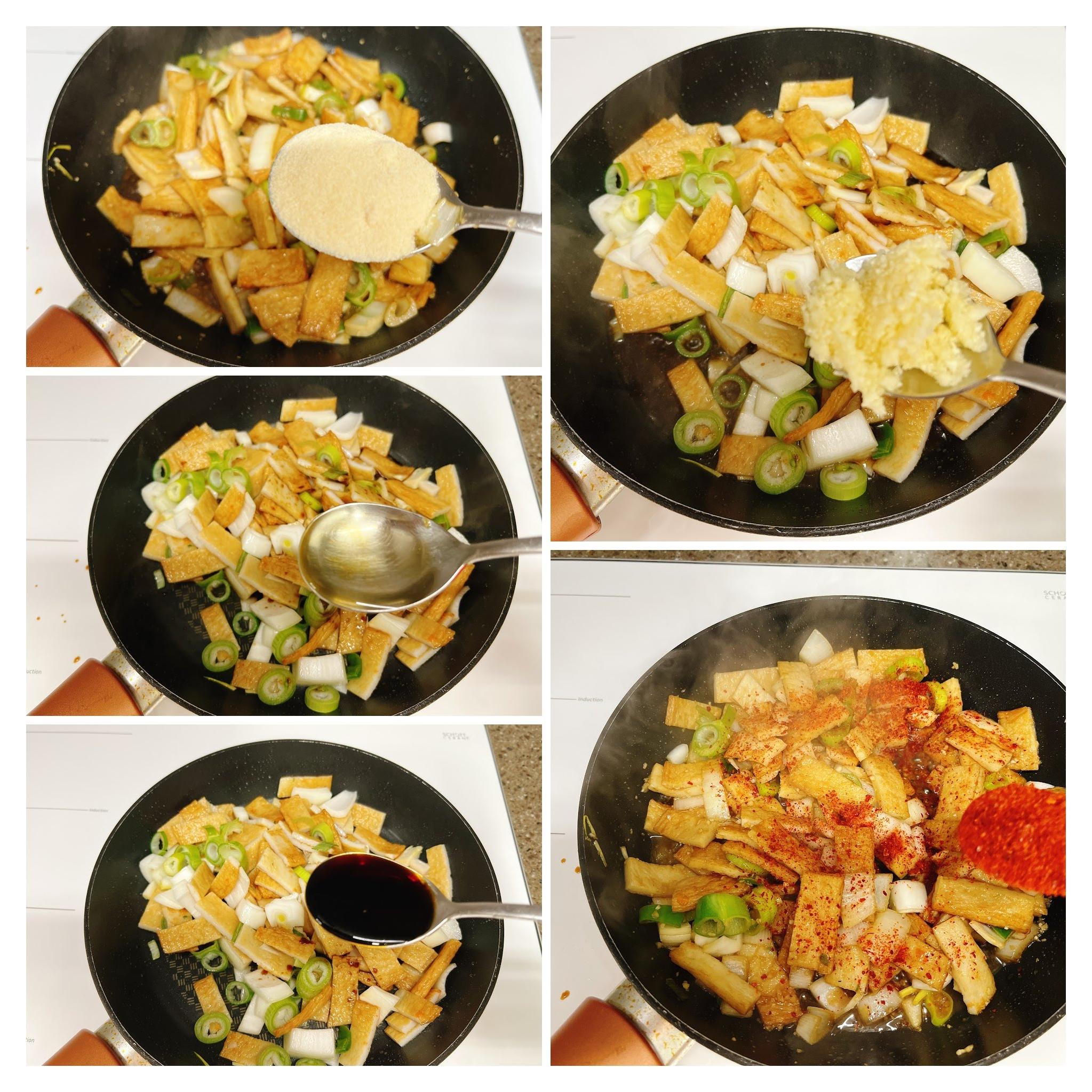 어묵을 먼저 넣고 잠시 볶다가 양파, 대파를 넣어 볶아요