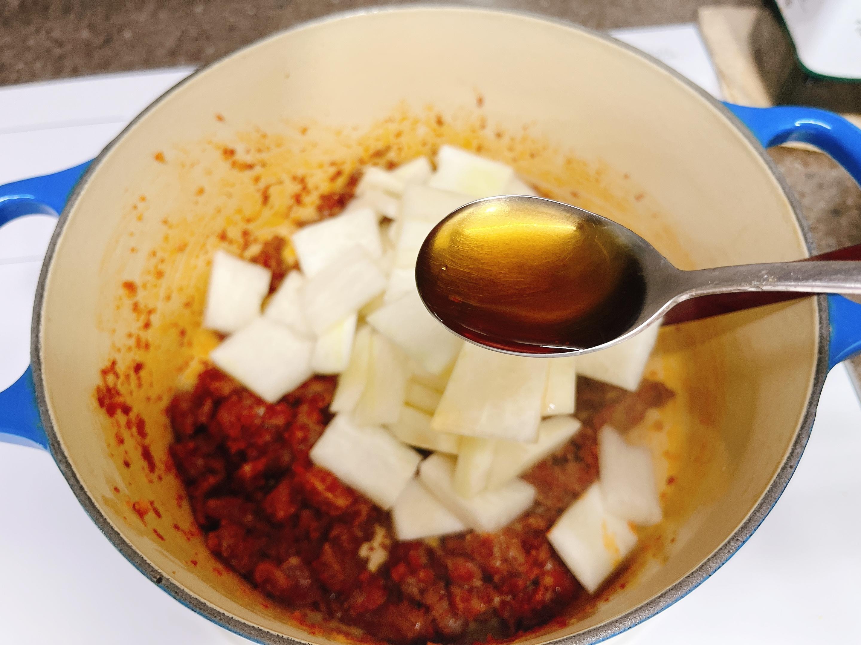 무를 넣어 볶는데 참치액 2~3스푼도 추가해서