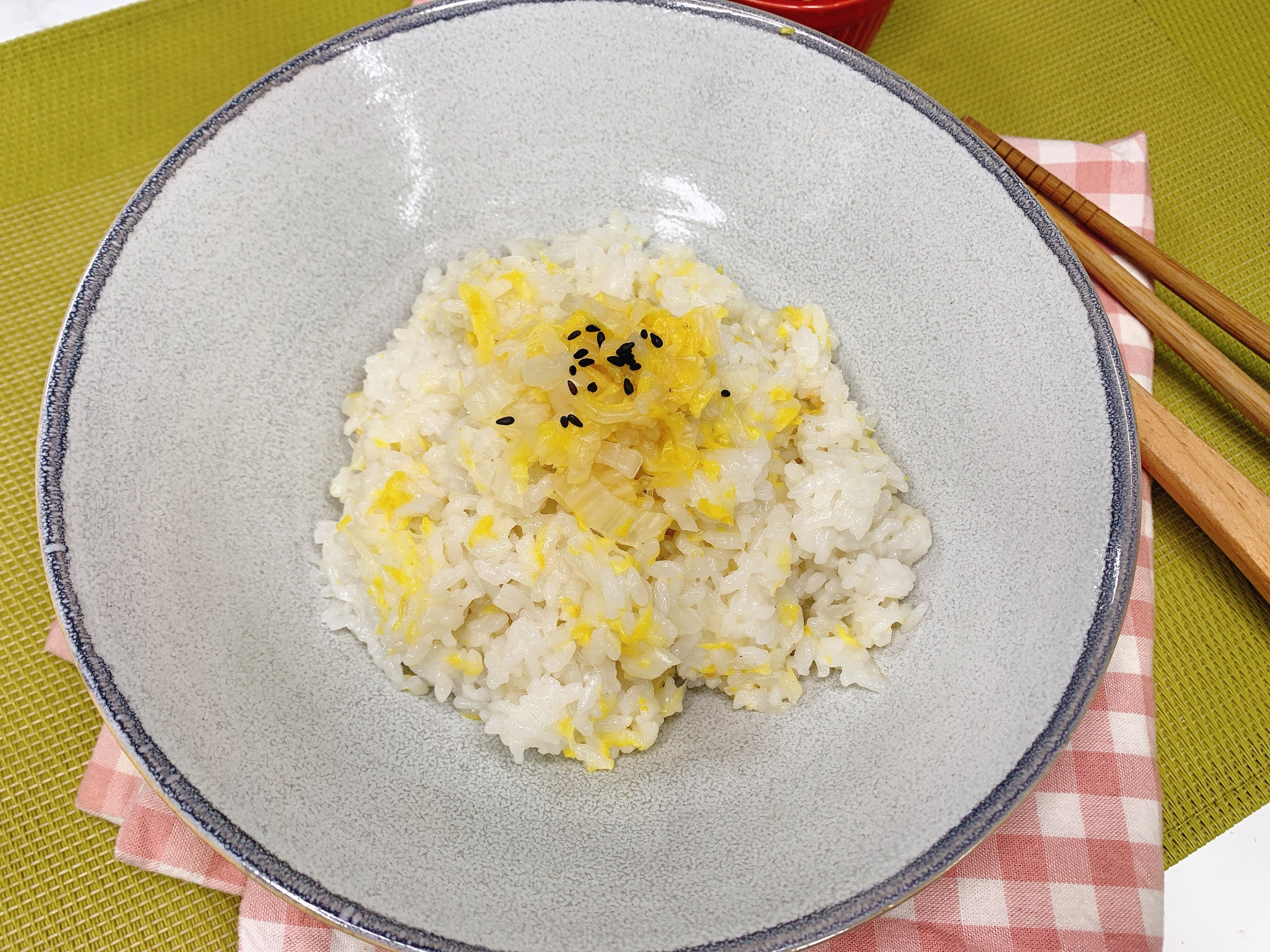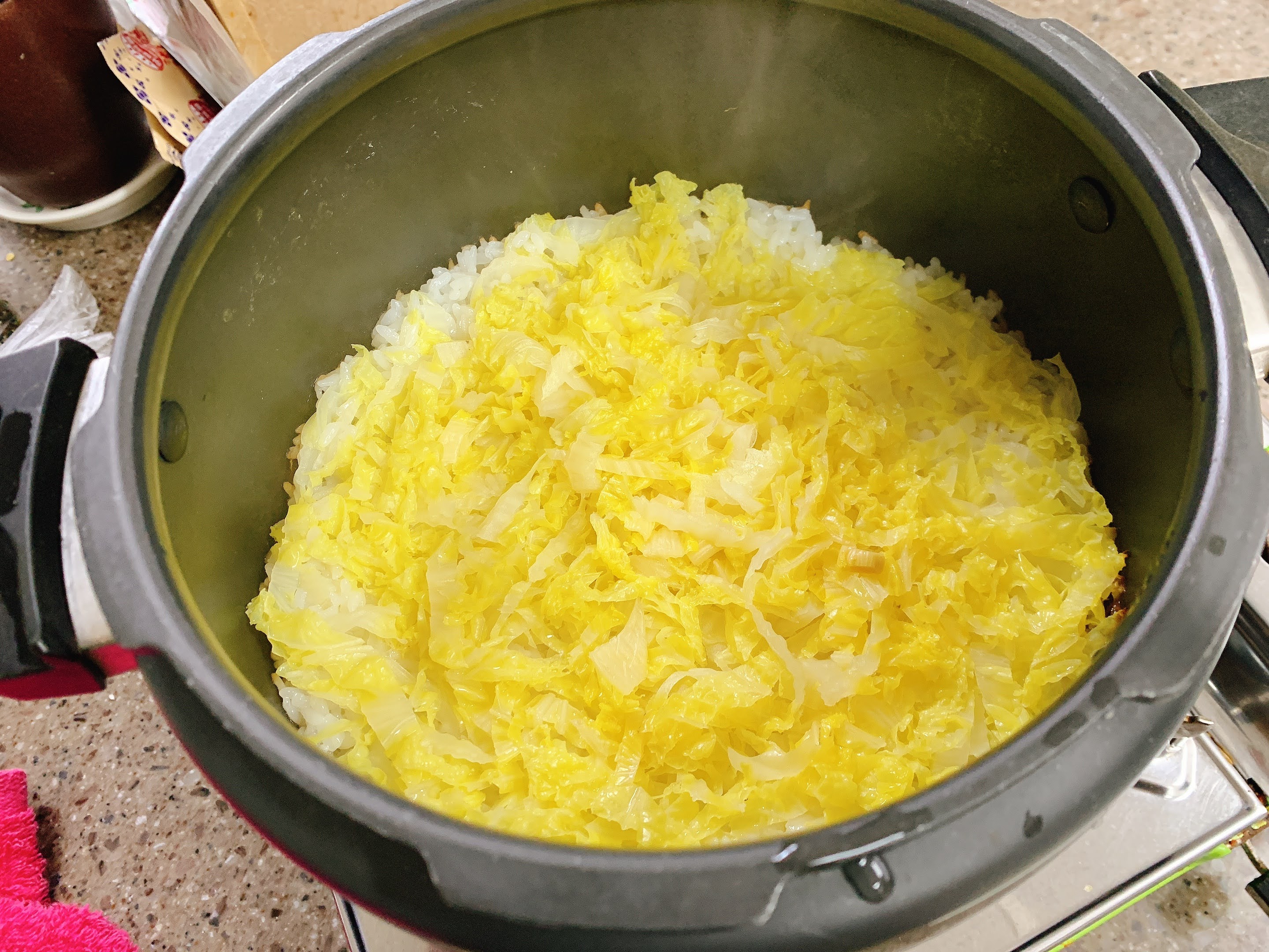 씻은 쌀에 배춧잎 썰어 넣어 밥을 하고