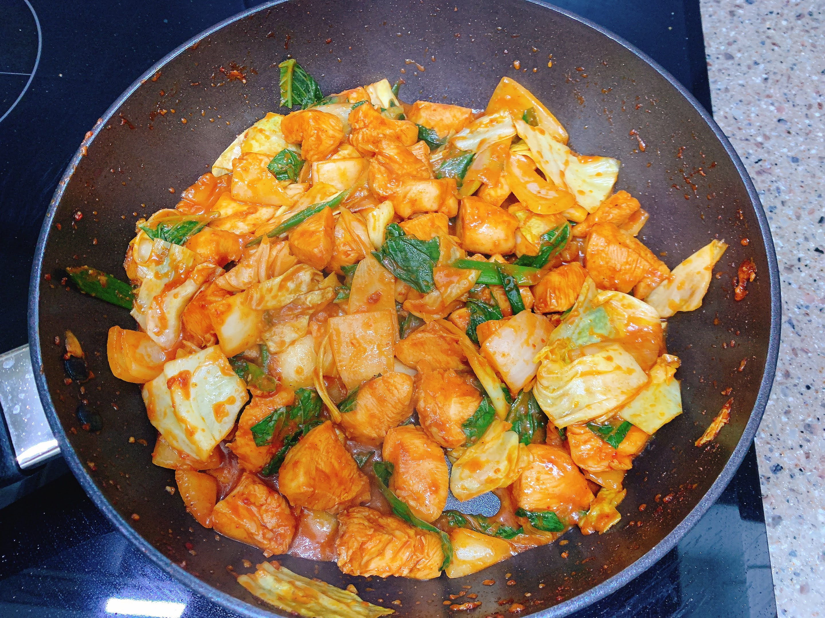 닭가슴살을 넣고 겉면이 익도록 볶아요
