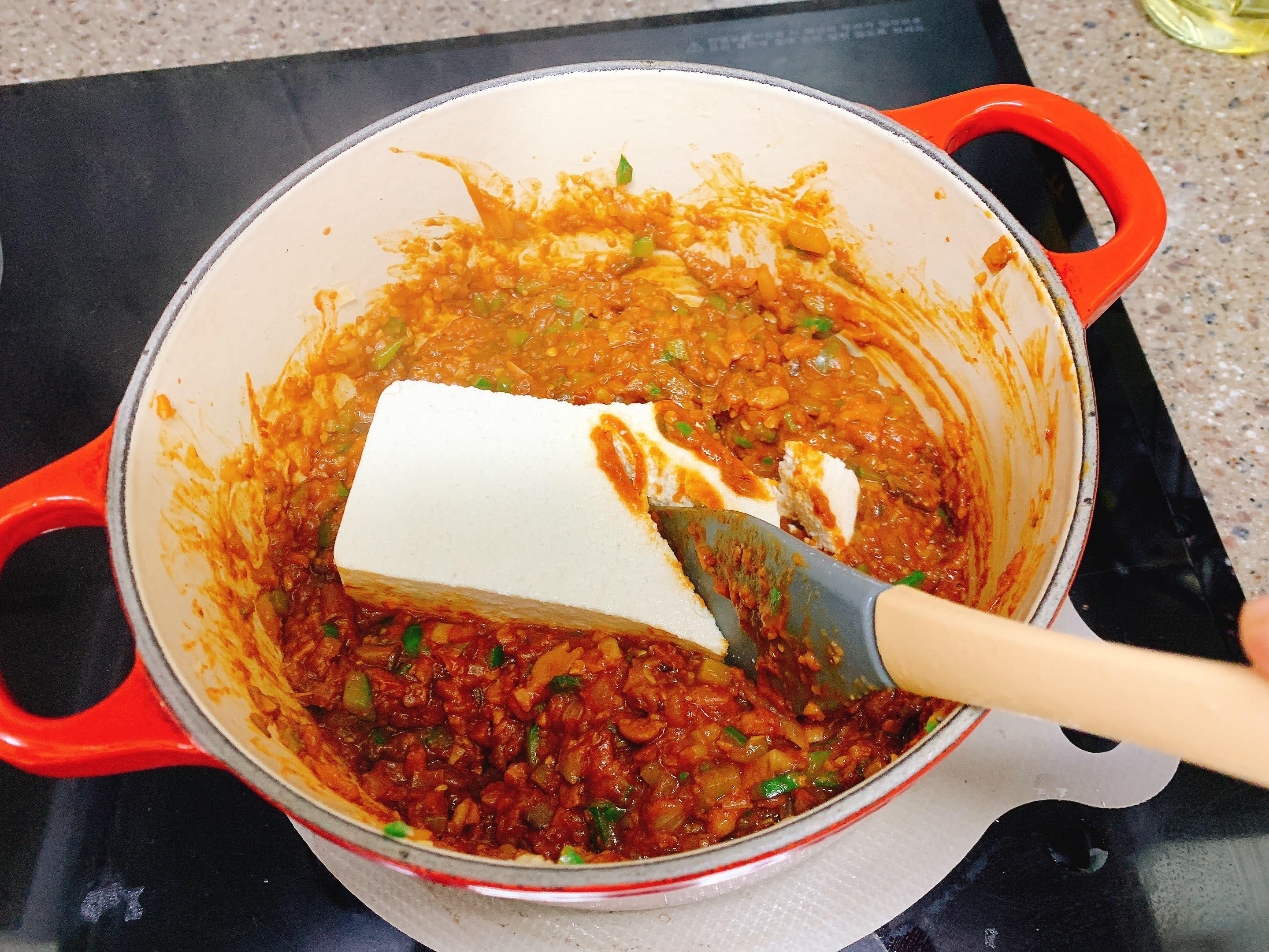 멸치육수를 넣고, 두부가 부드러워질 정도로