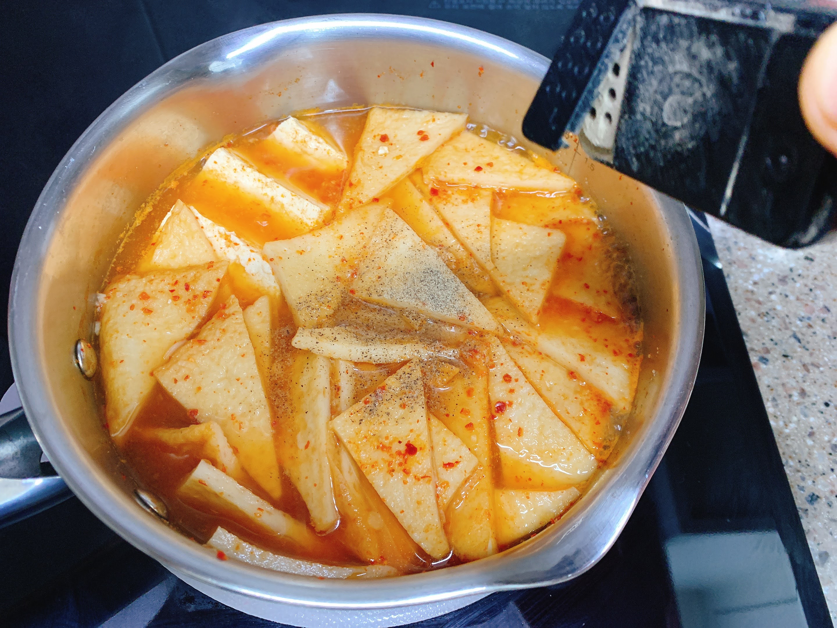 멸치와 다시마를 넣고 15분쯤 끓인 육수와 도톰한 사각어묵~