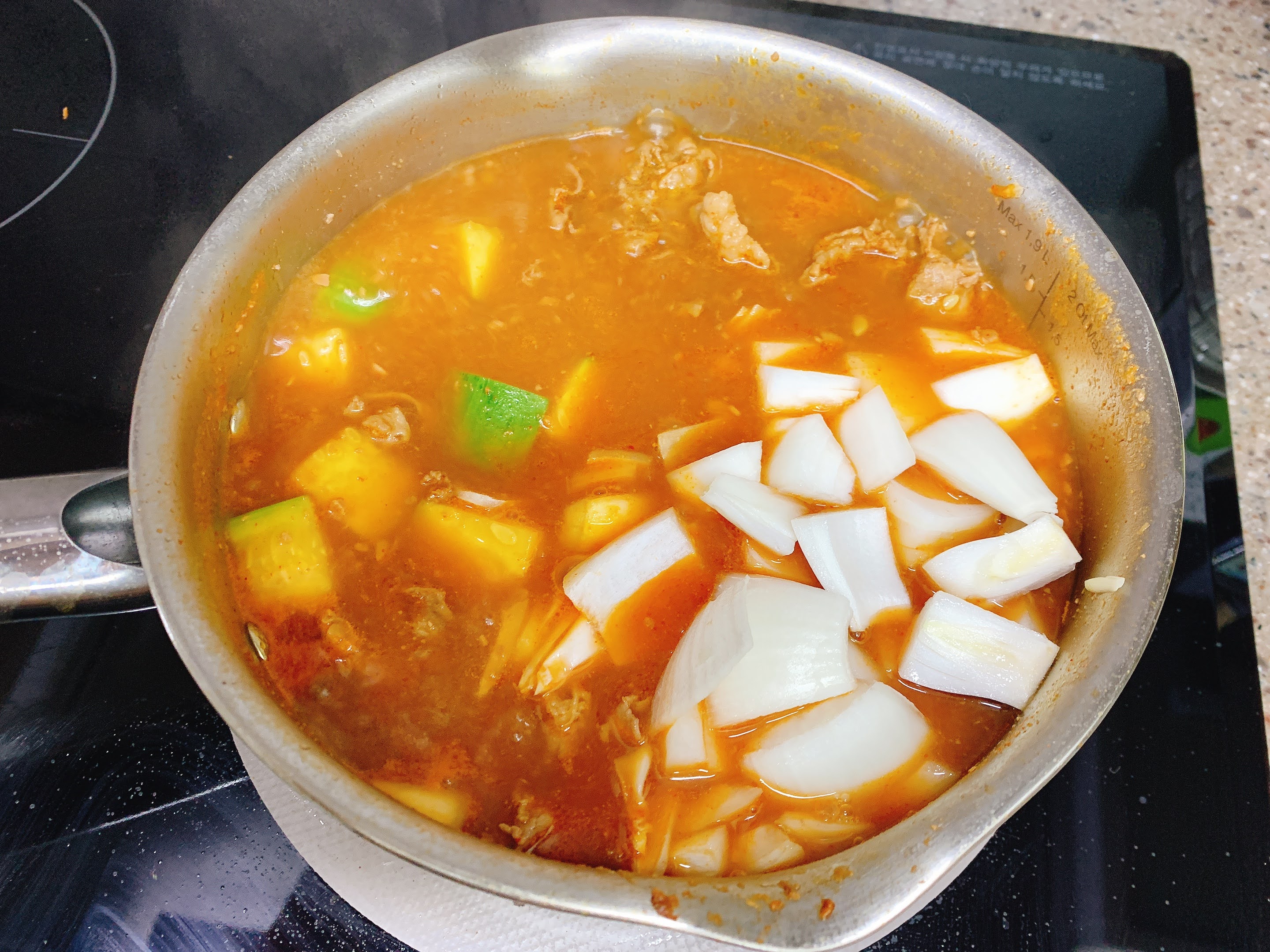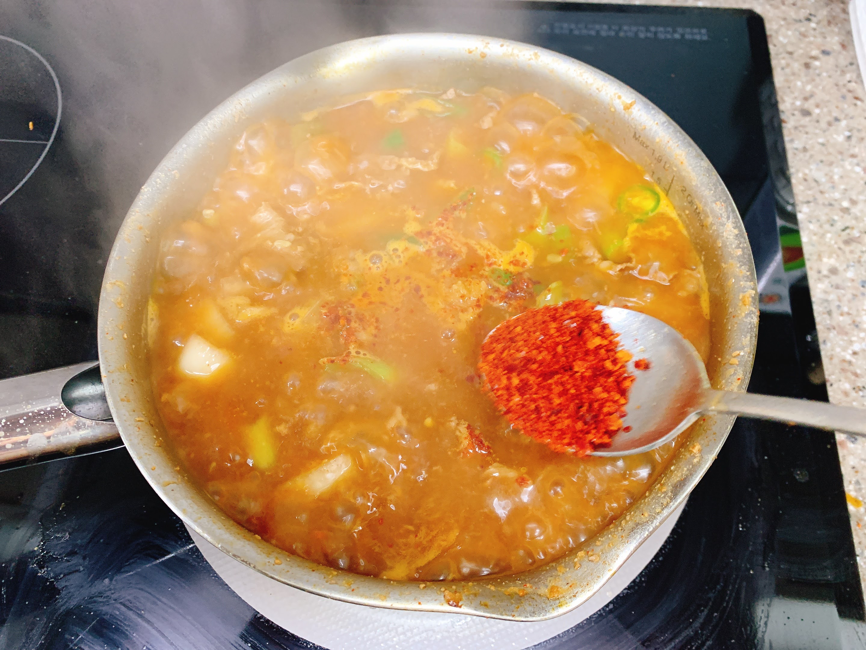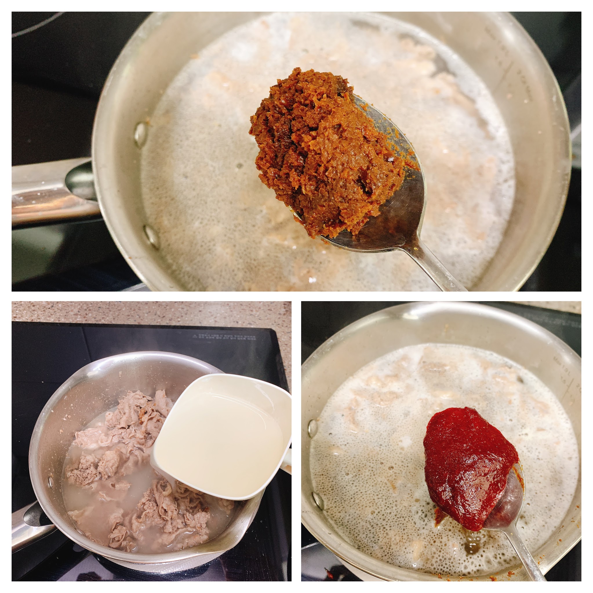 볶아진 차돌에 쌀뜨물을 붓고 된장과 고추장을 풀어