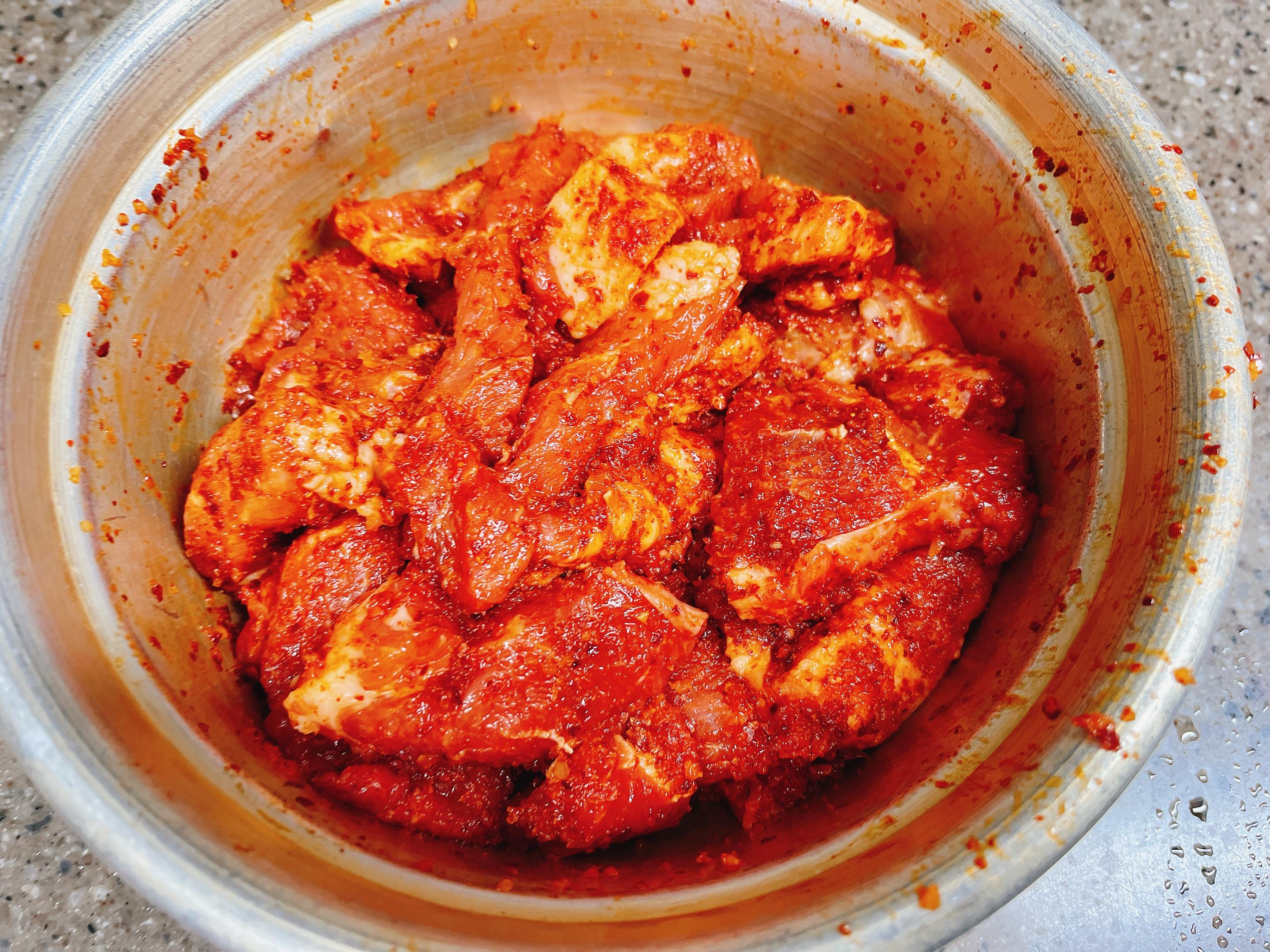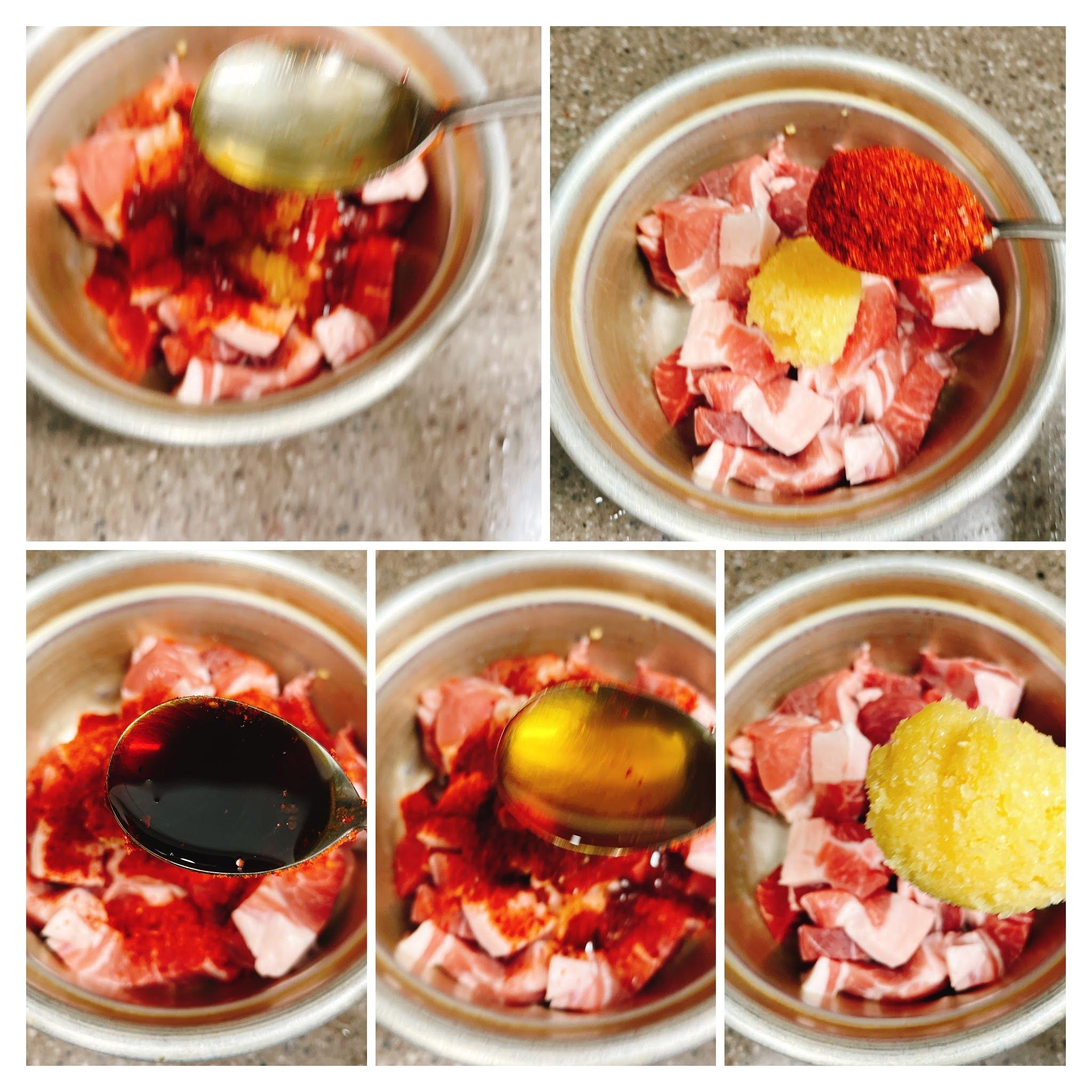 돼지고기 양념 : 고추가루 2스푼, 진간장 2스푼, 맛술 2스푼
