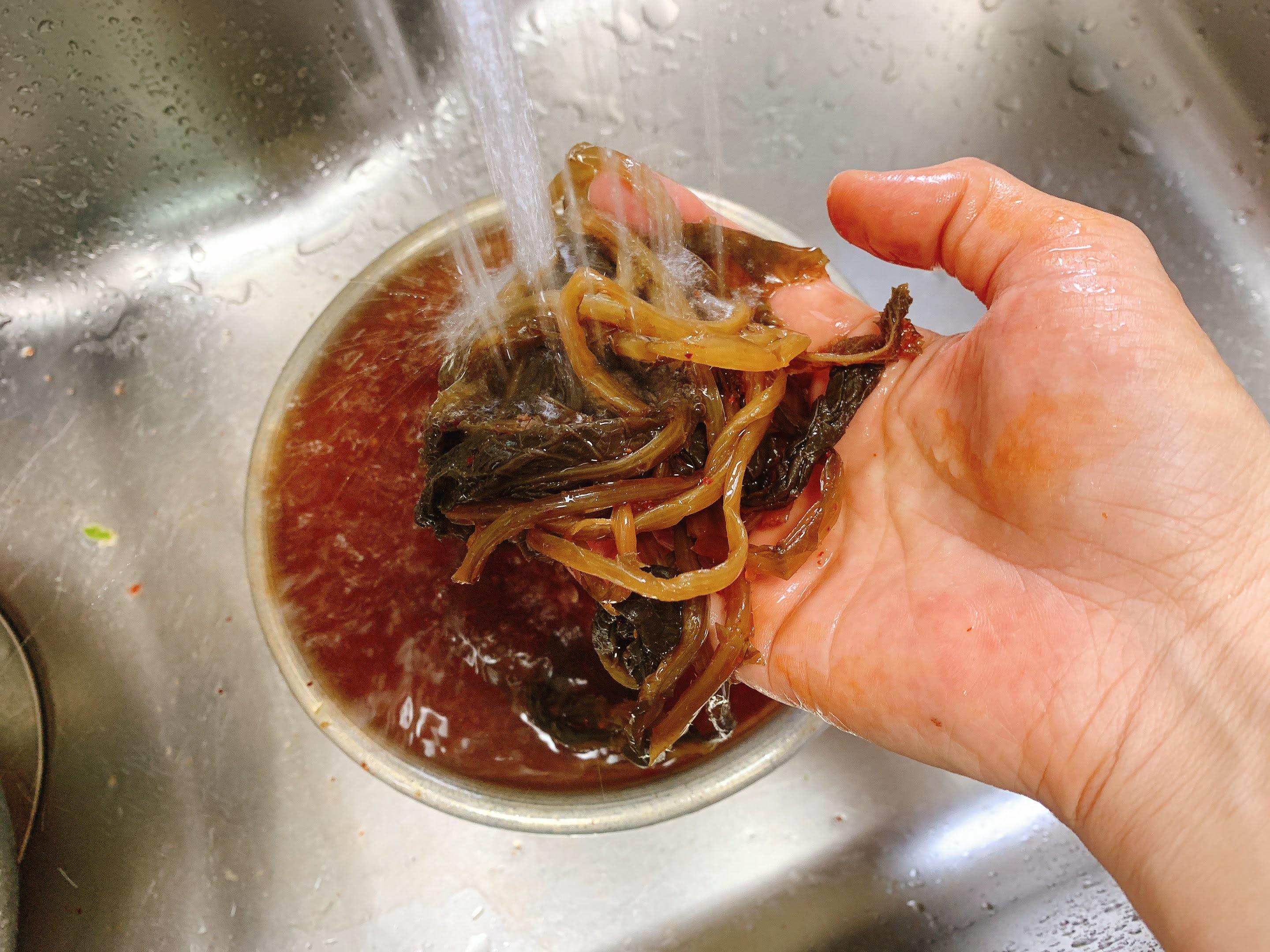흐르는 물에 김치양념을 씻어요