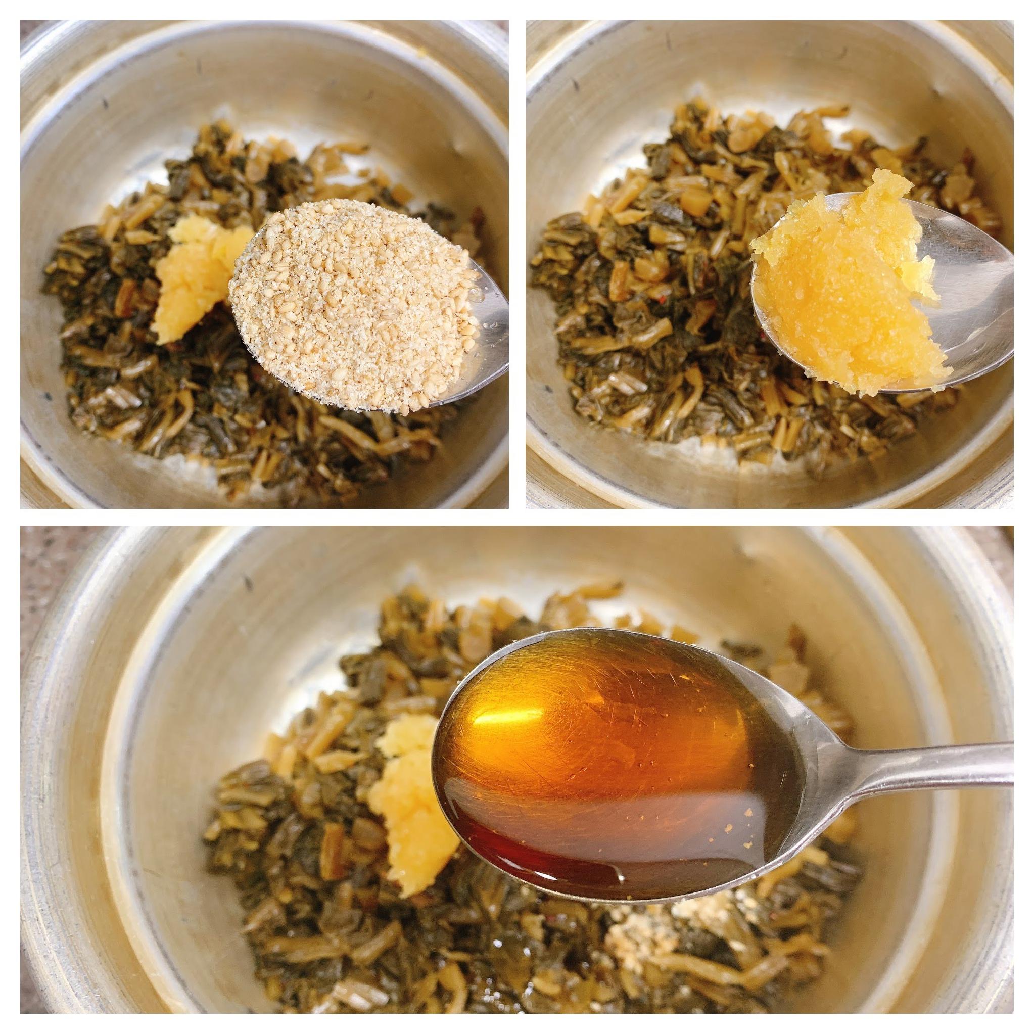 다진마늘, 참기름(또는 들기름), 깨소금