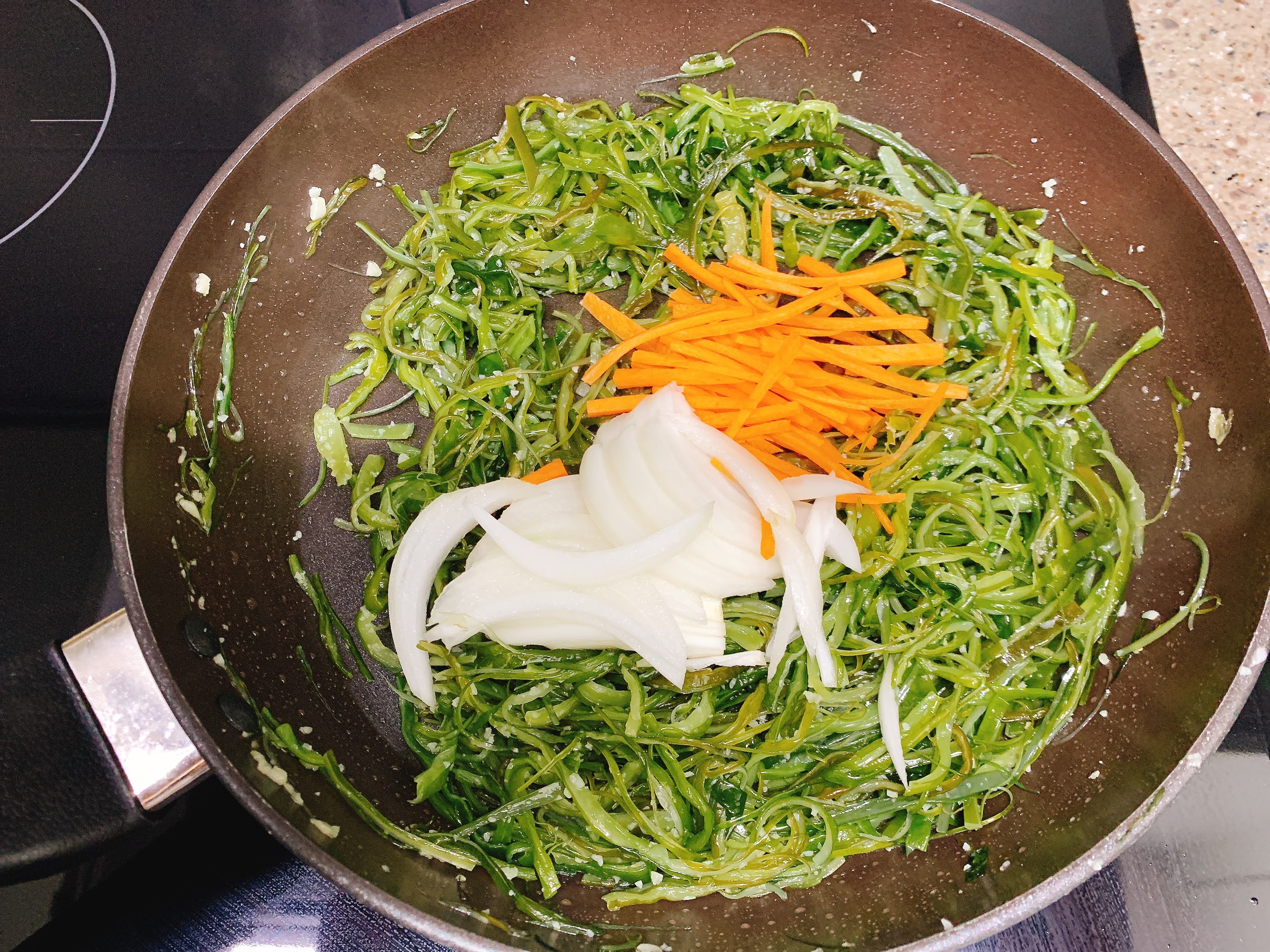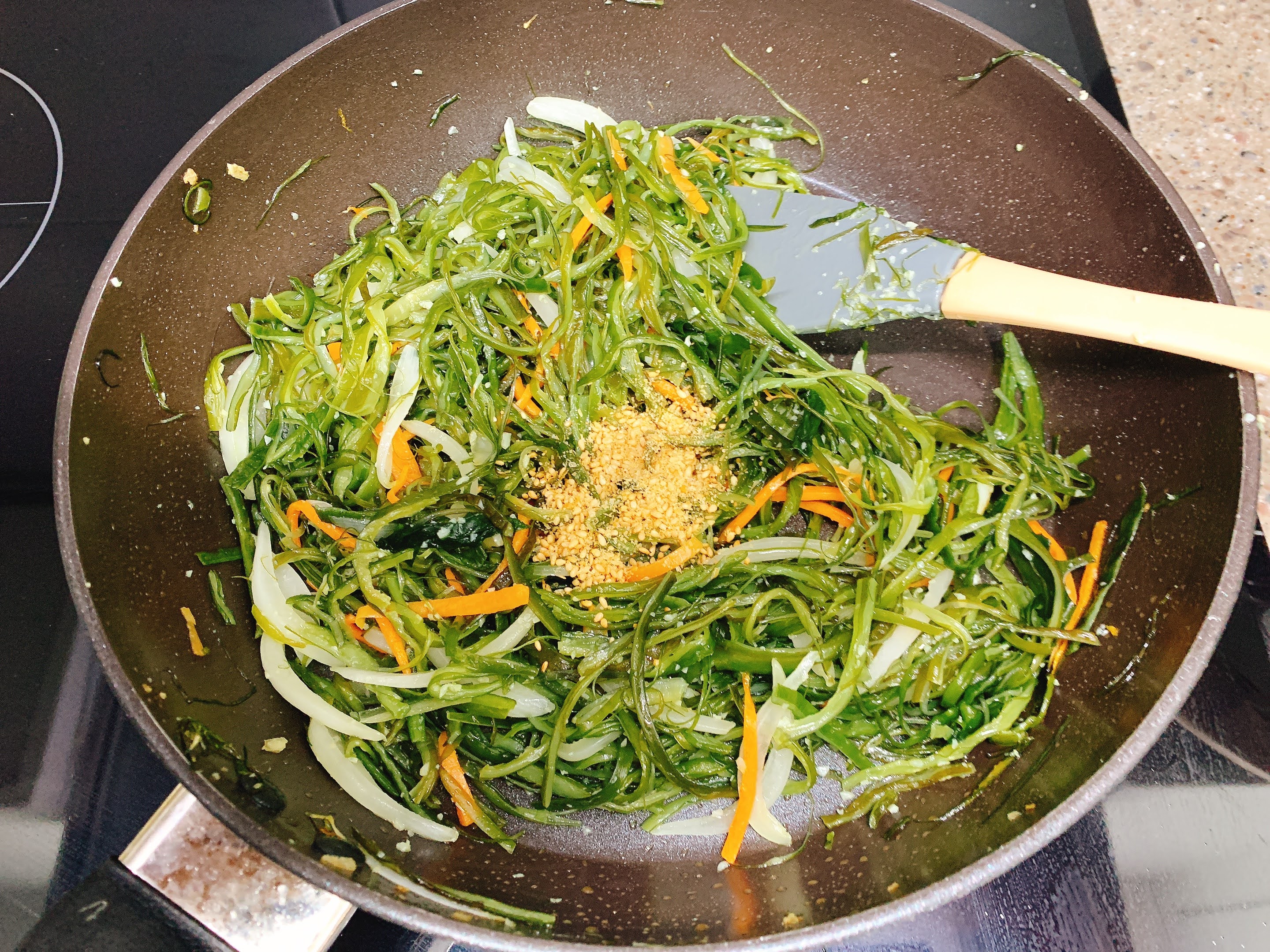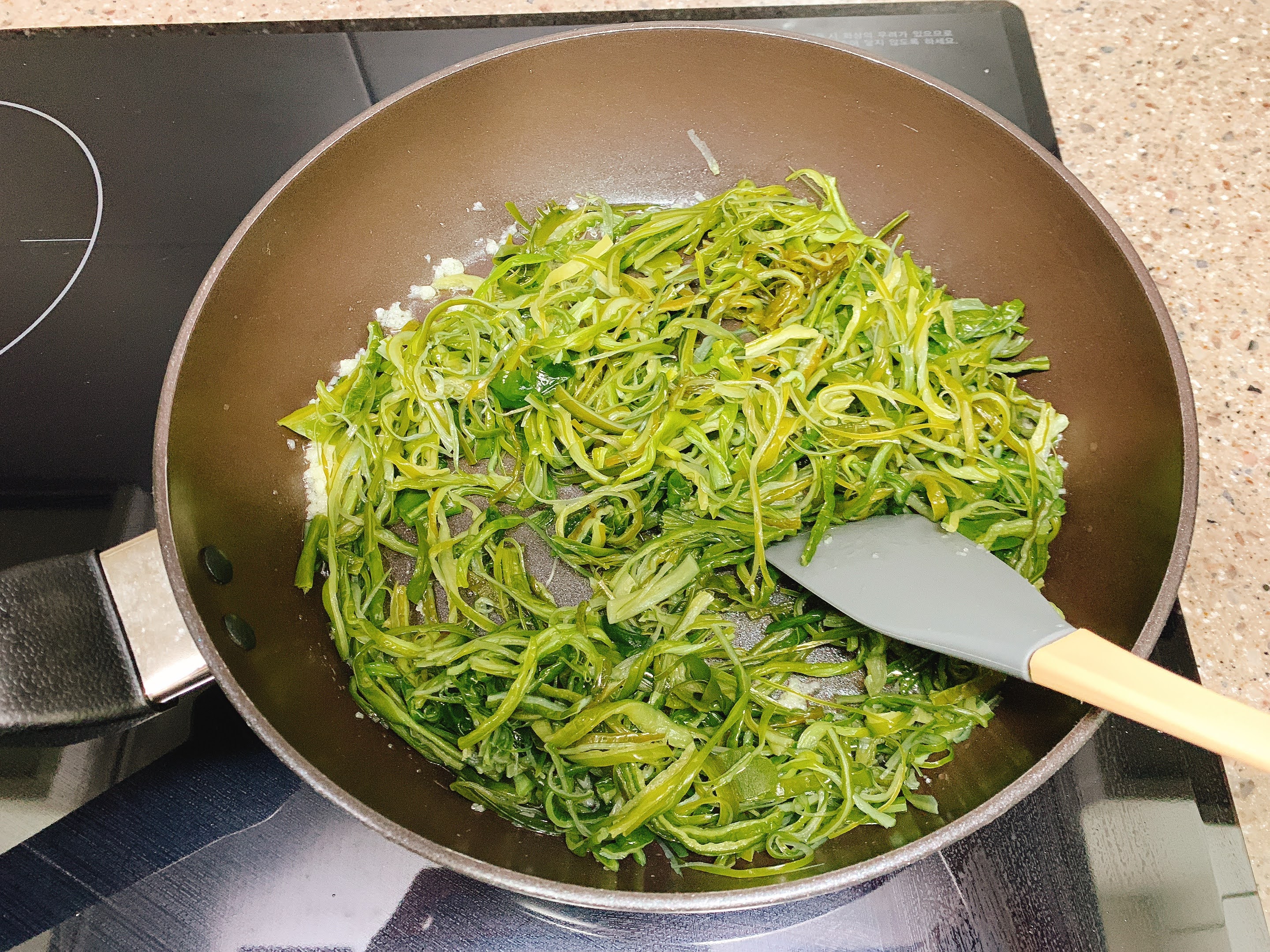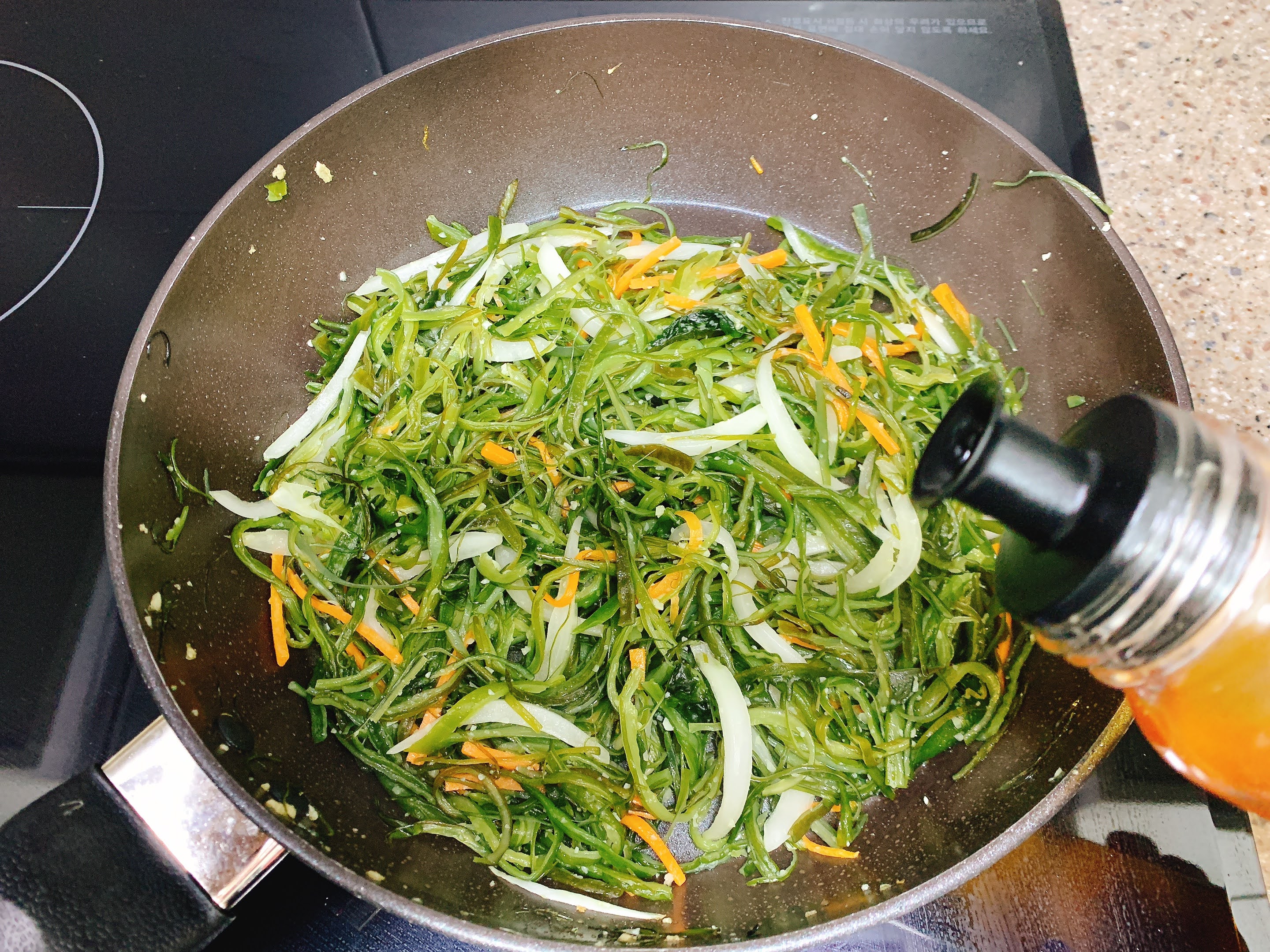 썰어둔 미역줄기를 넣고 3분정도 볶아요