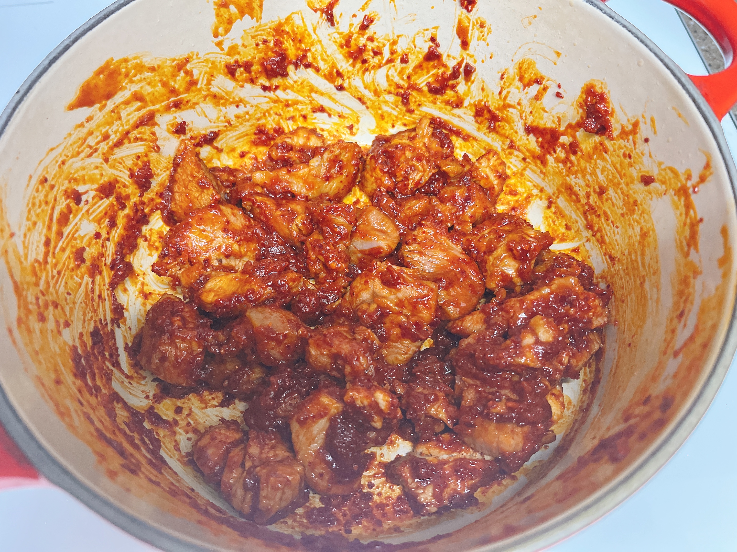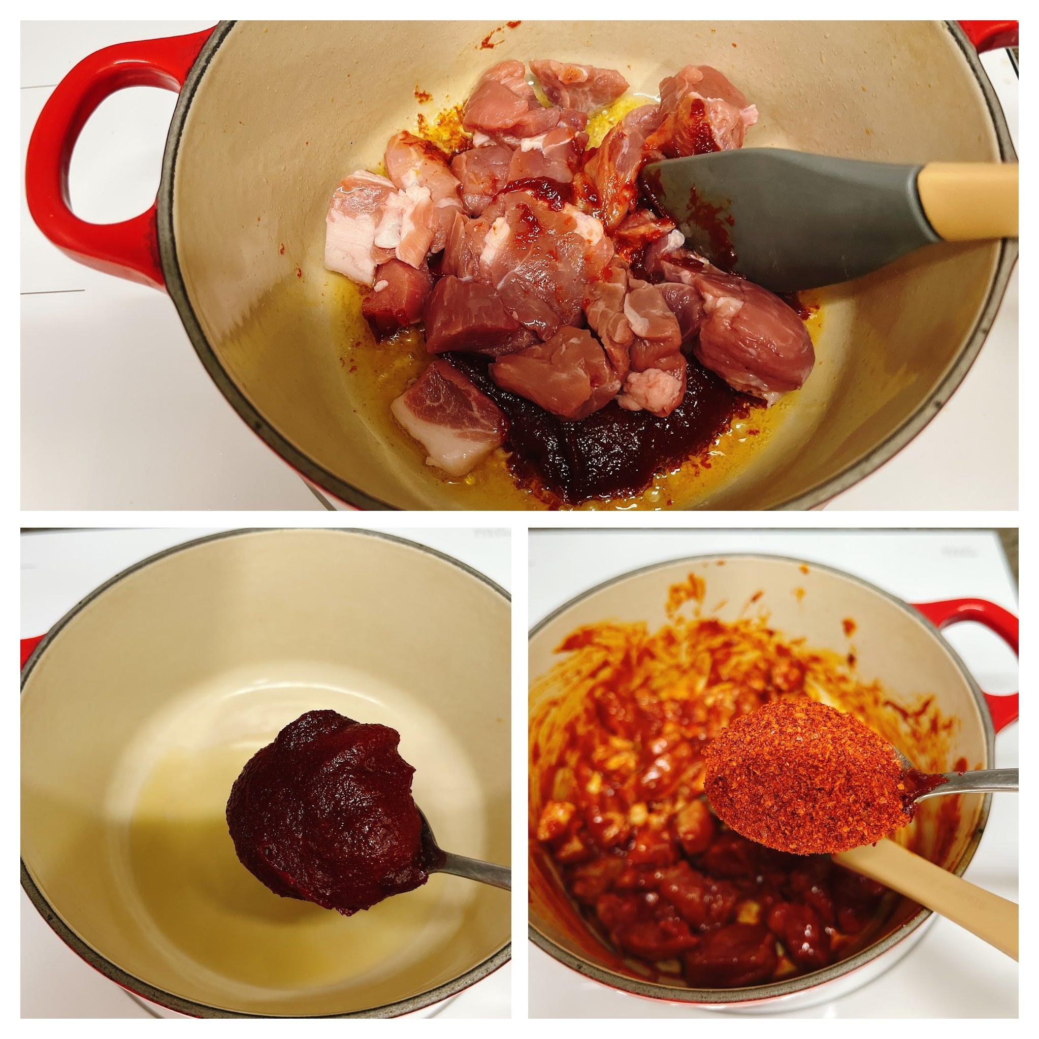 고추장 크게 한스푼과 돼지고기를 넣고 은근하게 충분히 볶다가