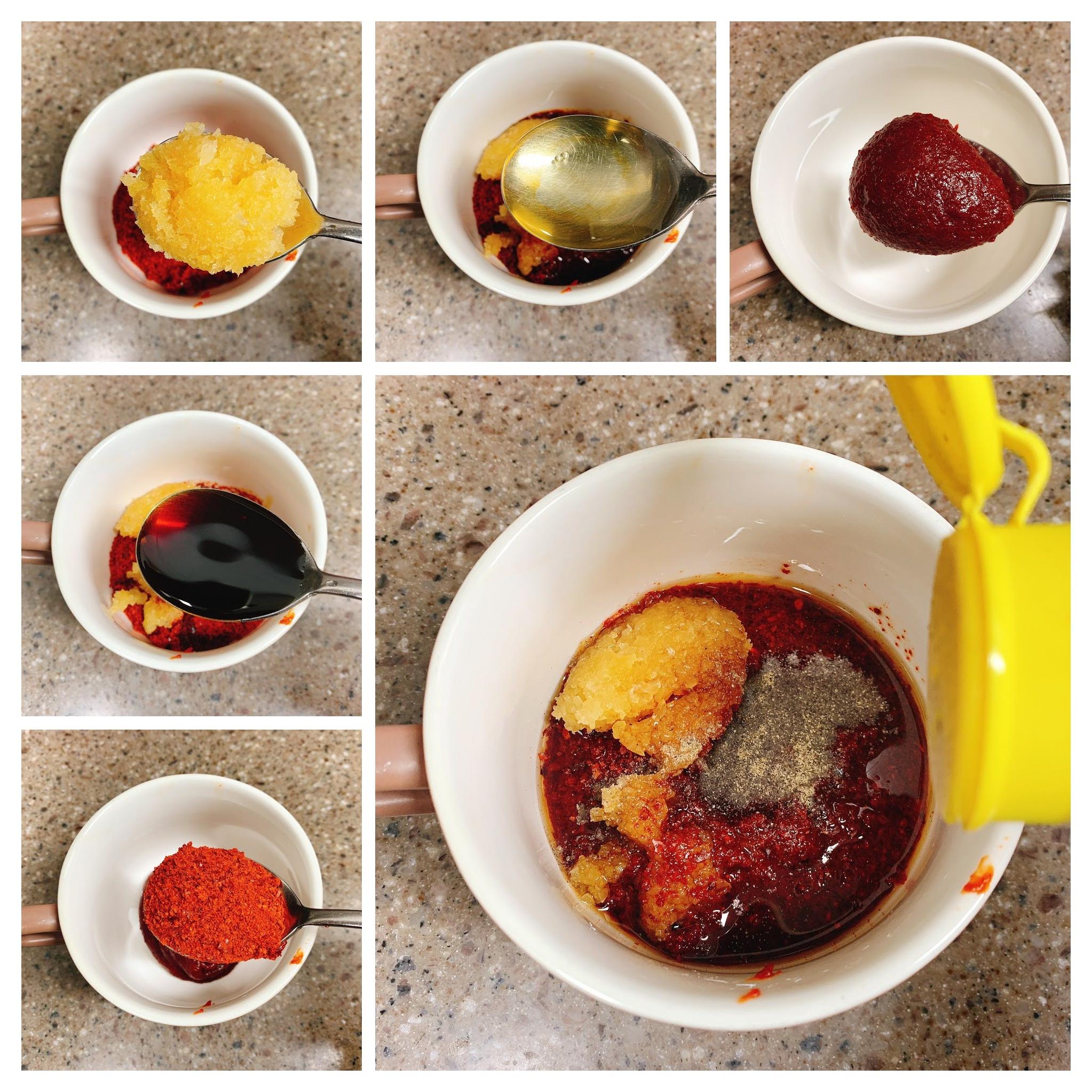 진간장 3스푼, 고추장 1.5스푼, 고추가루 2.5스푼