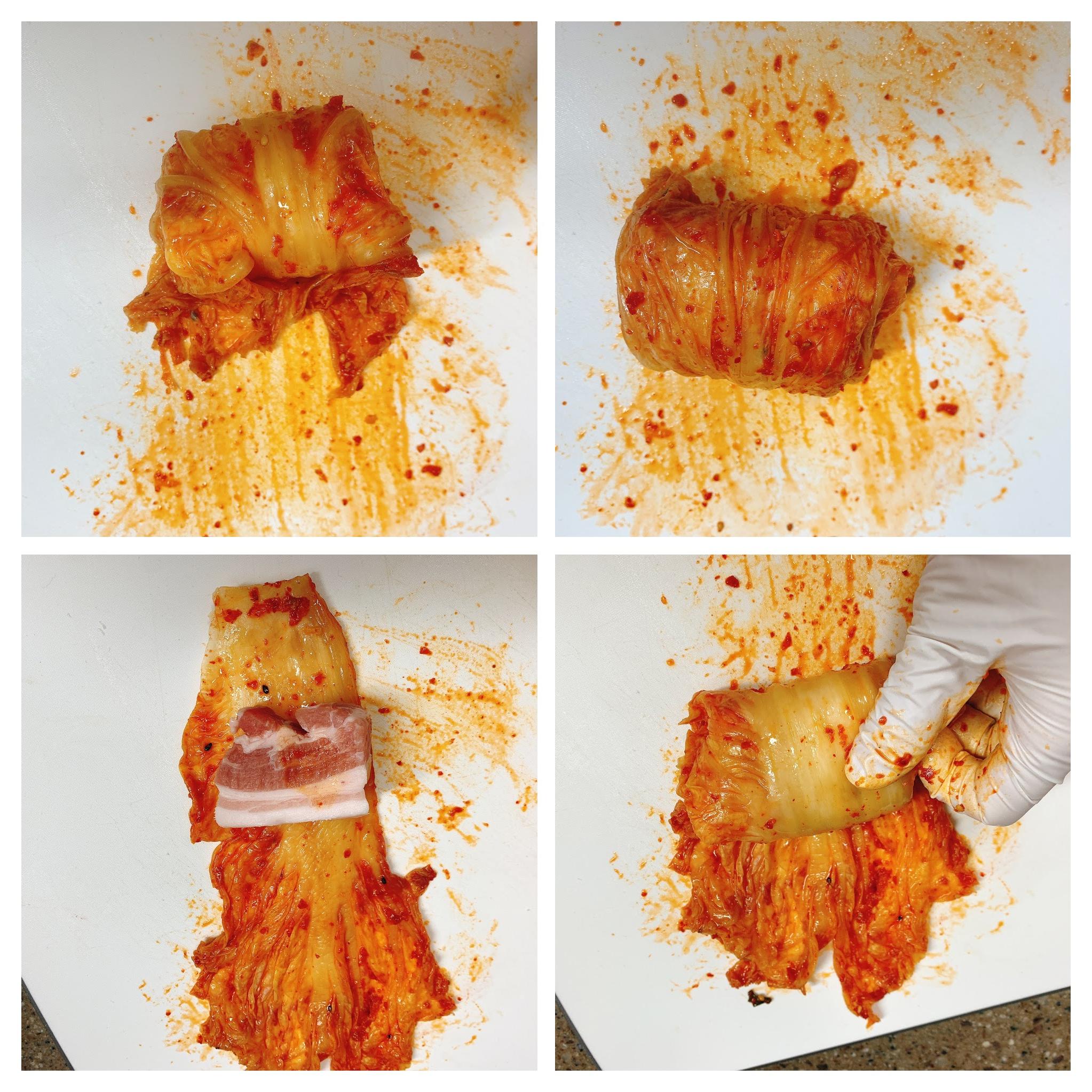 김치잎 한장장에 썰어준 삼겹살을 한개씩 넣어