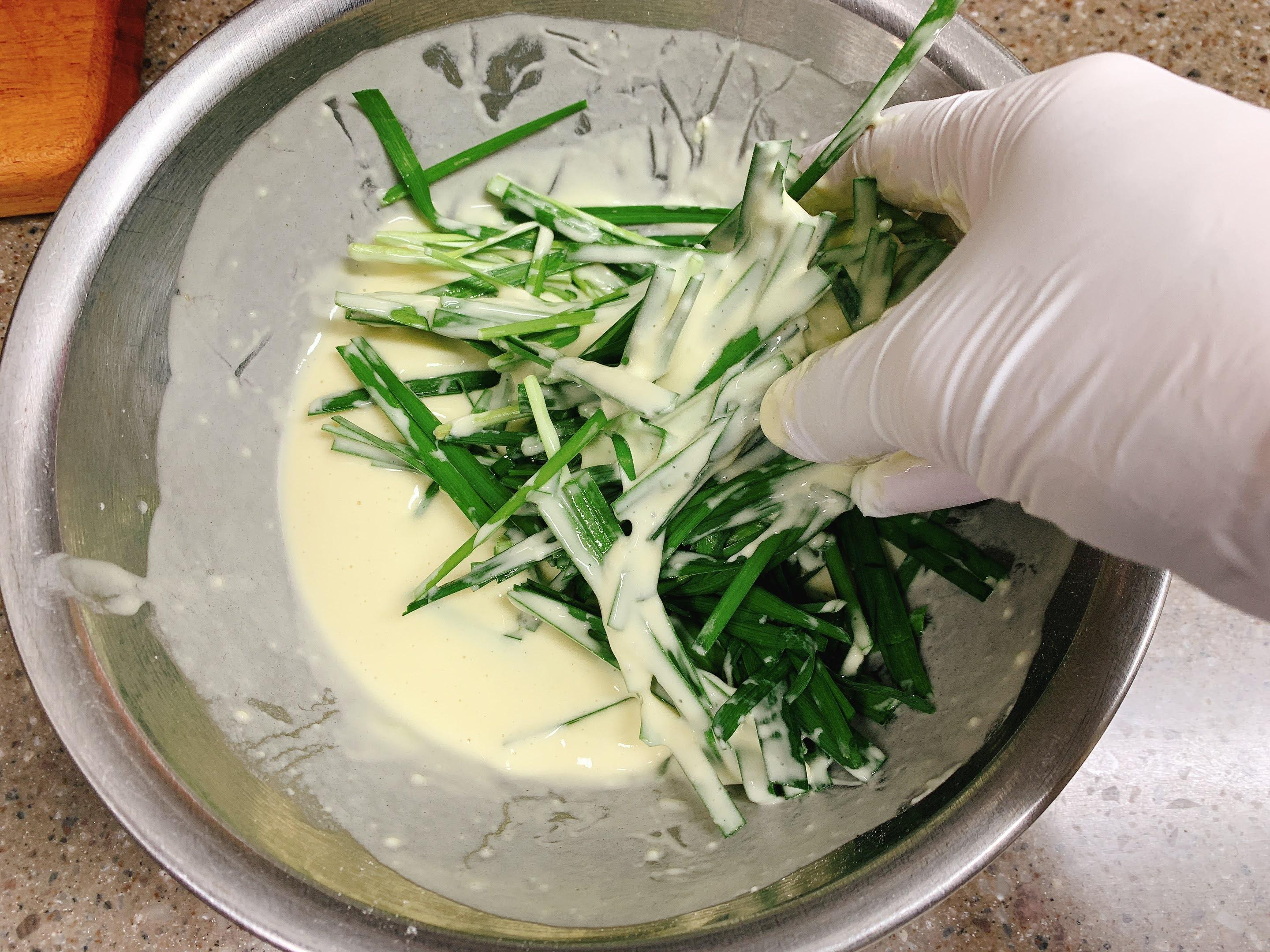 반죽에 썰어둔 부추는 넣고 반죽을 가볍게 입혀줘요