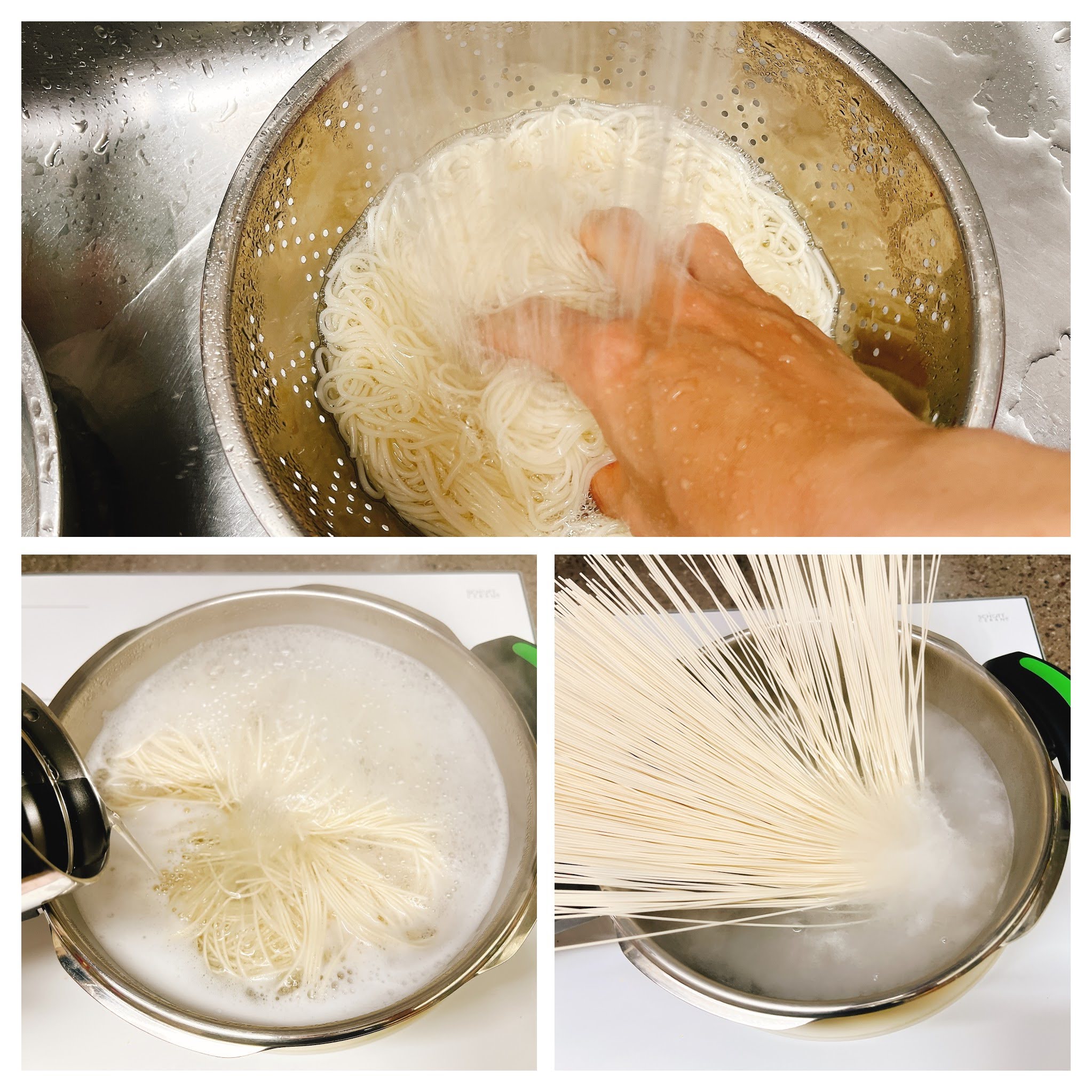 3번째 끓어오르면 찬물에 빠르게 헹궈요