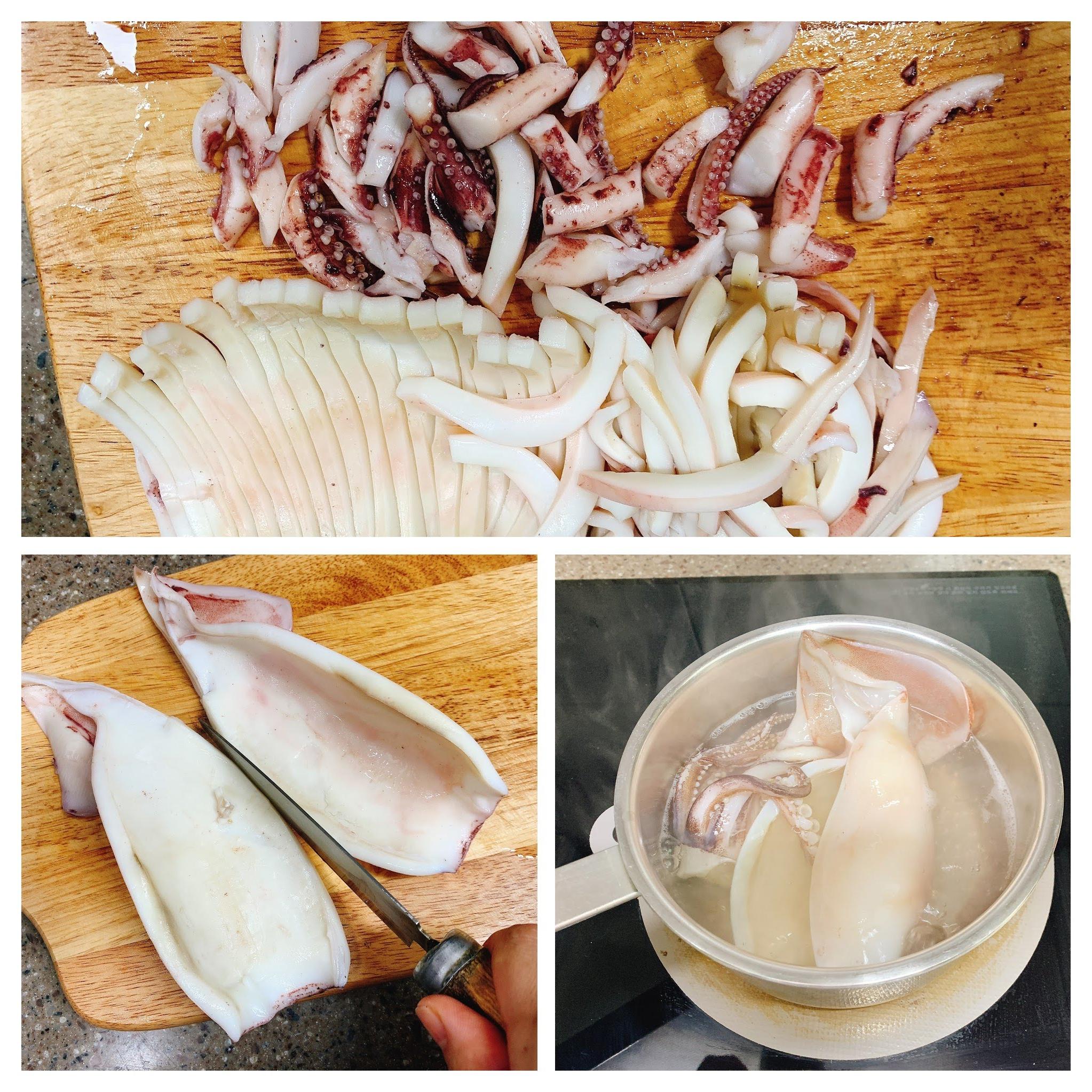 오징어는 끓는 물에 가볍게 데쳐 건져낸후 한김 식혀서