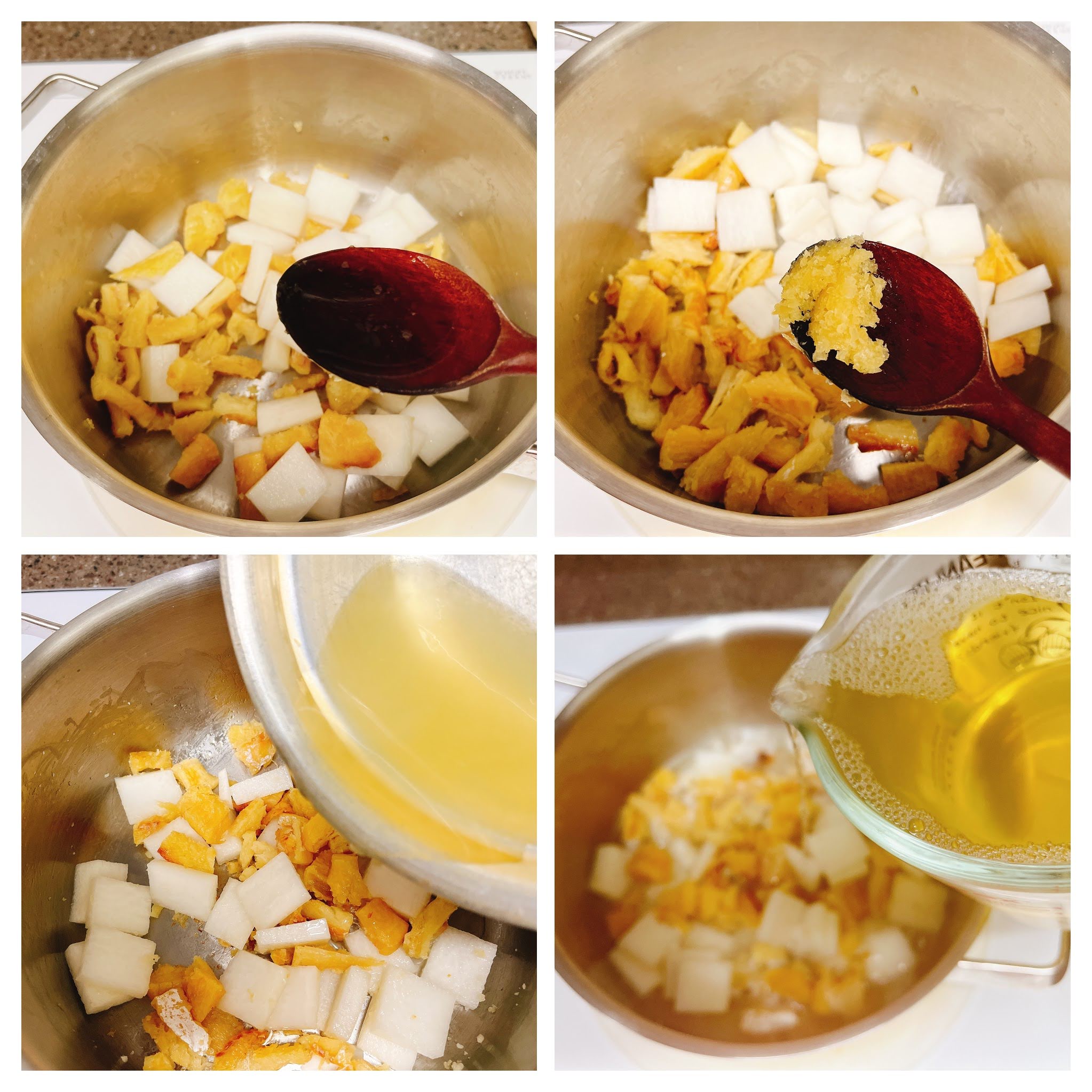 썰어둔 무, 다진마늘 그리고 참치액 1스푼을