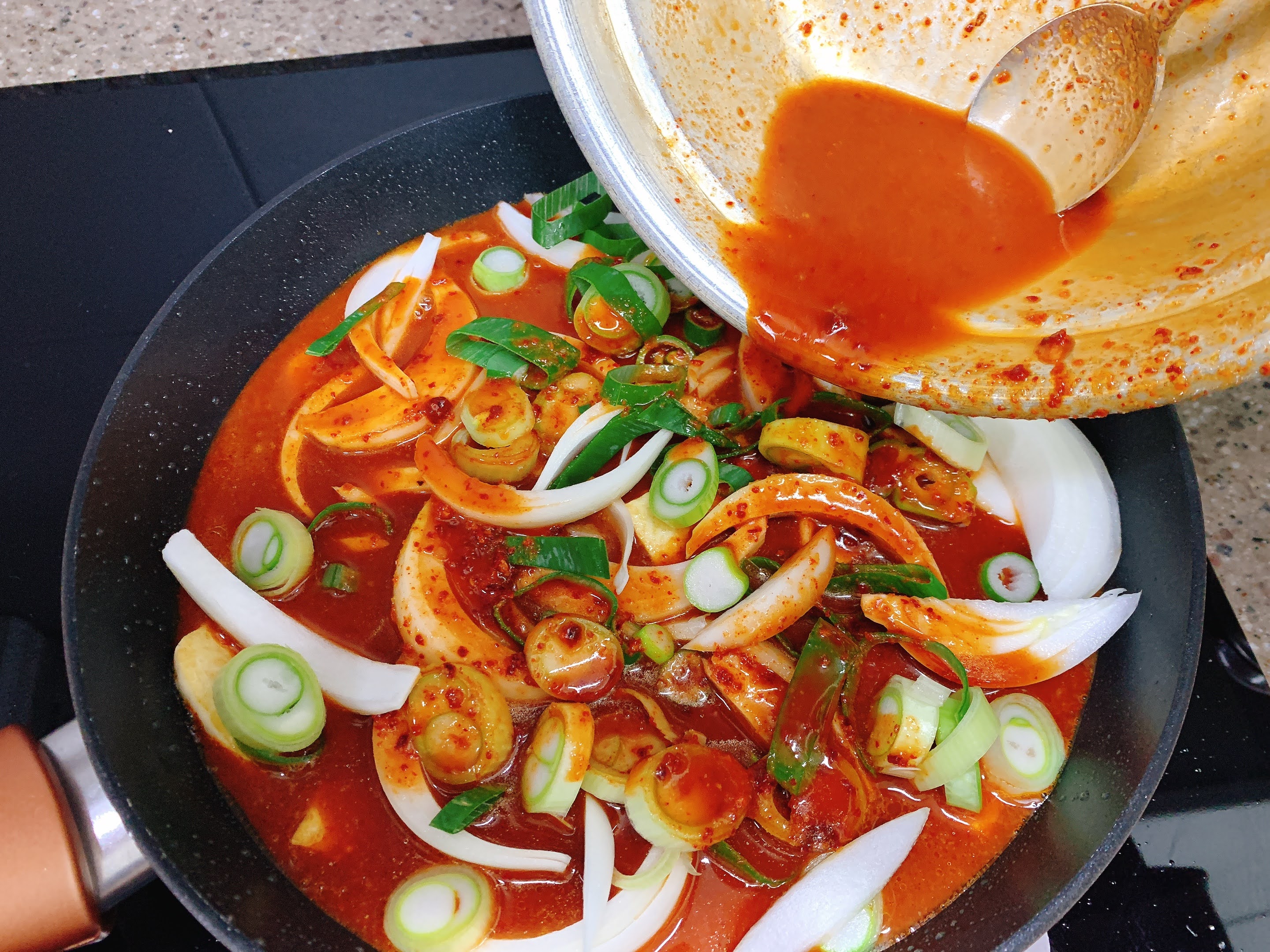 그위에 만들어두었던 양념을 붓고 끓여요~