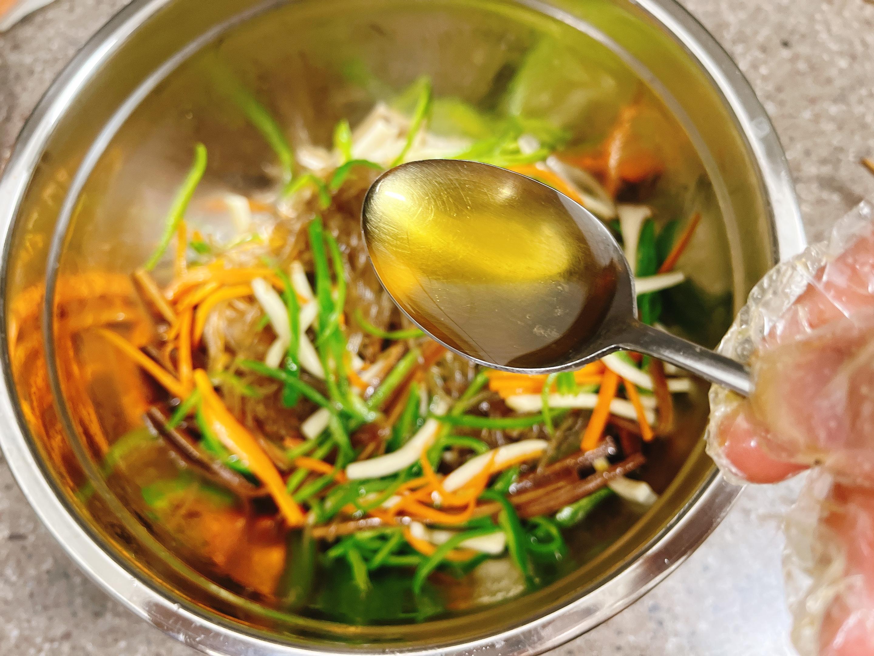 삶은 당면은 채에 받쳐두고, (헹굼 ×)