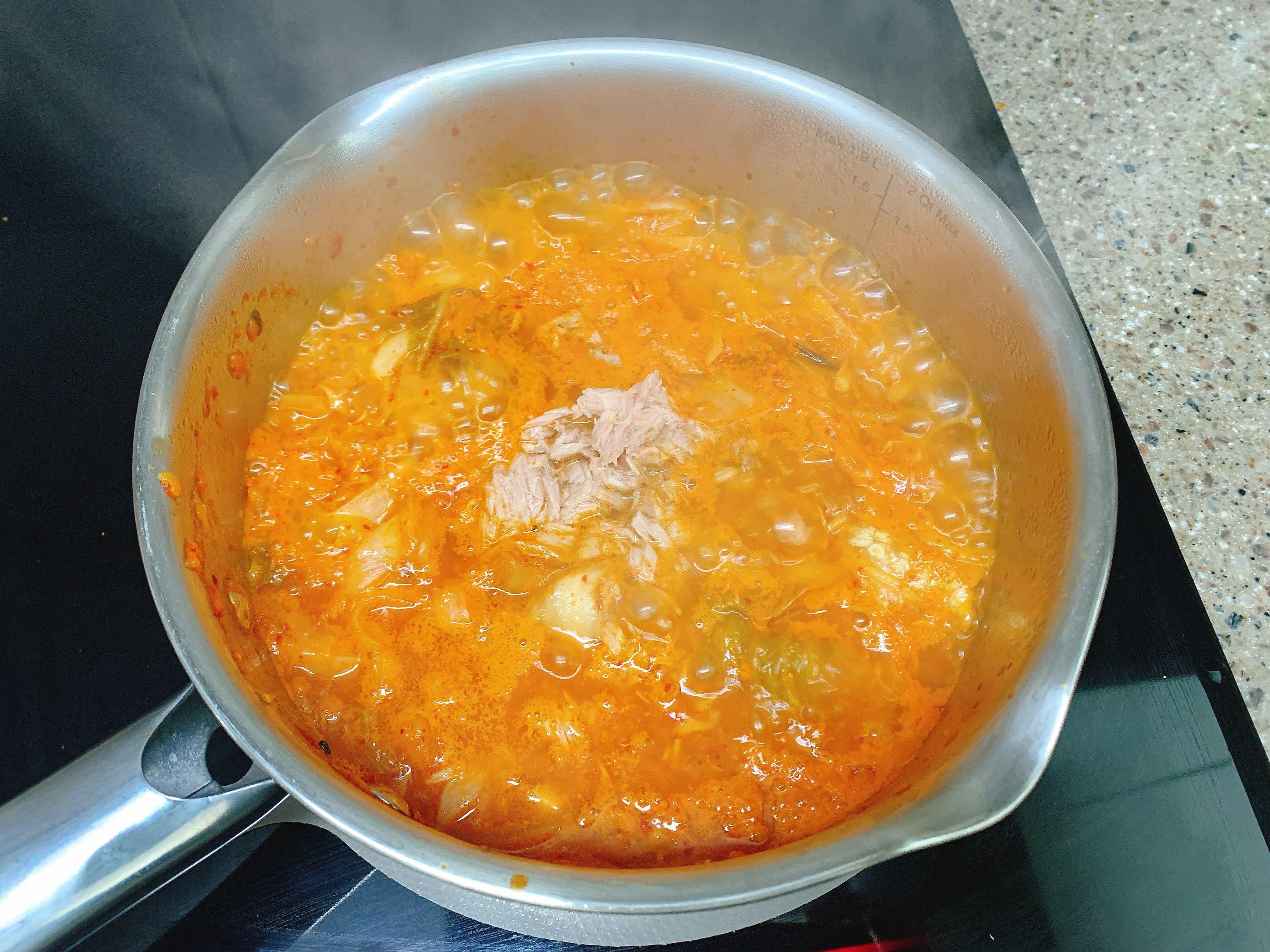 기름뺀 참치를 넣고~한소큼 끓여요