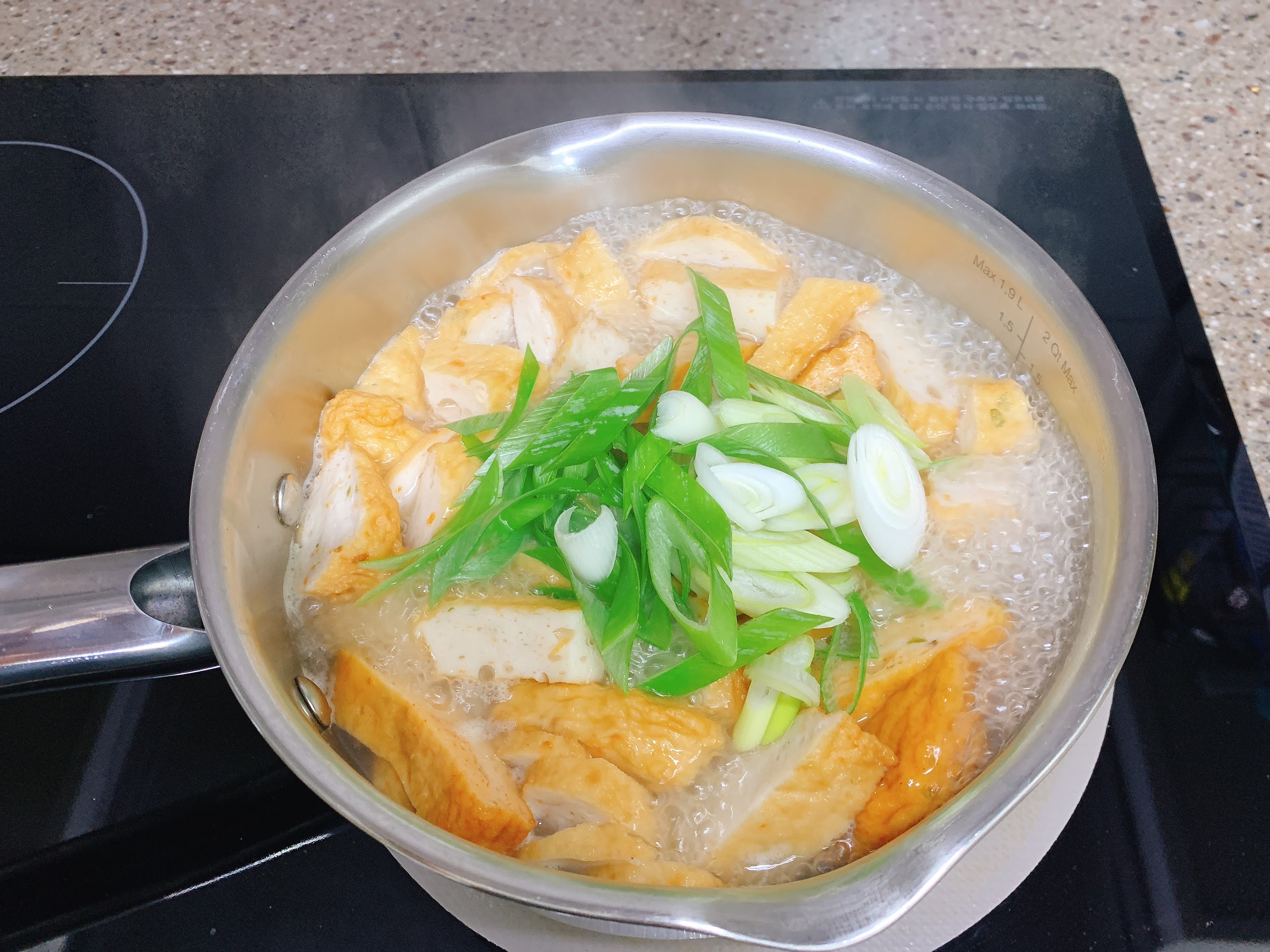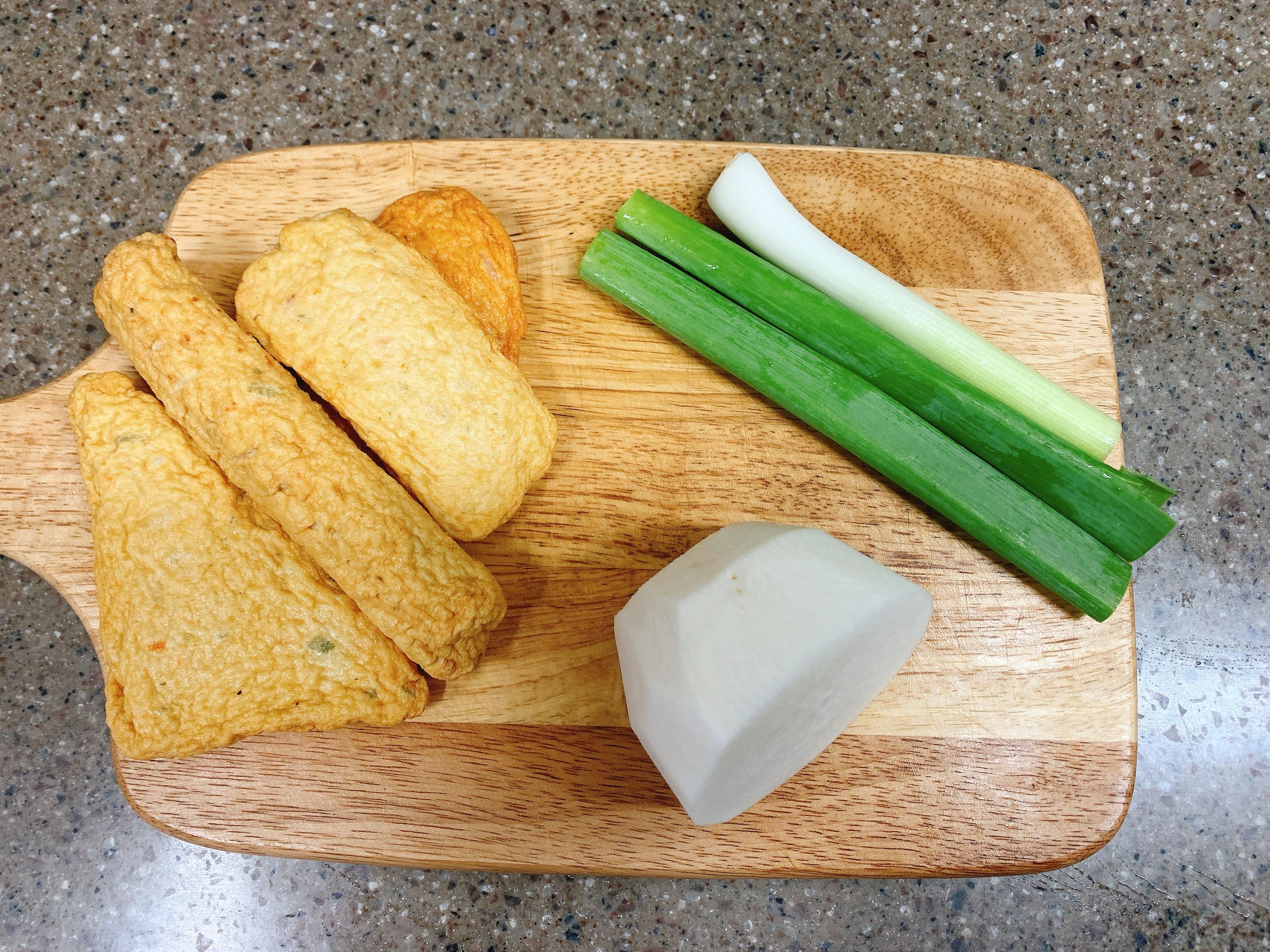 무 끓이는 동안 어묵과 대파를 썰었어요