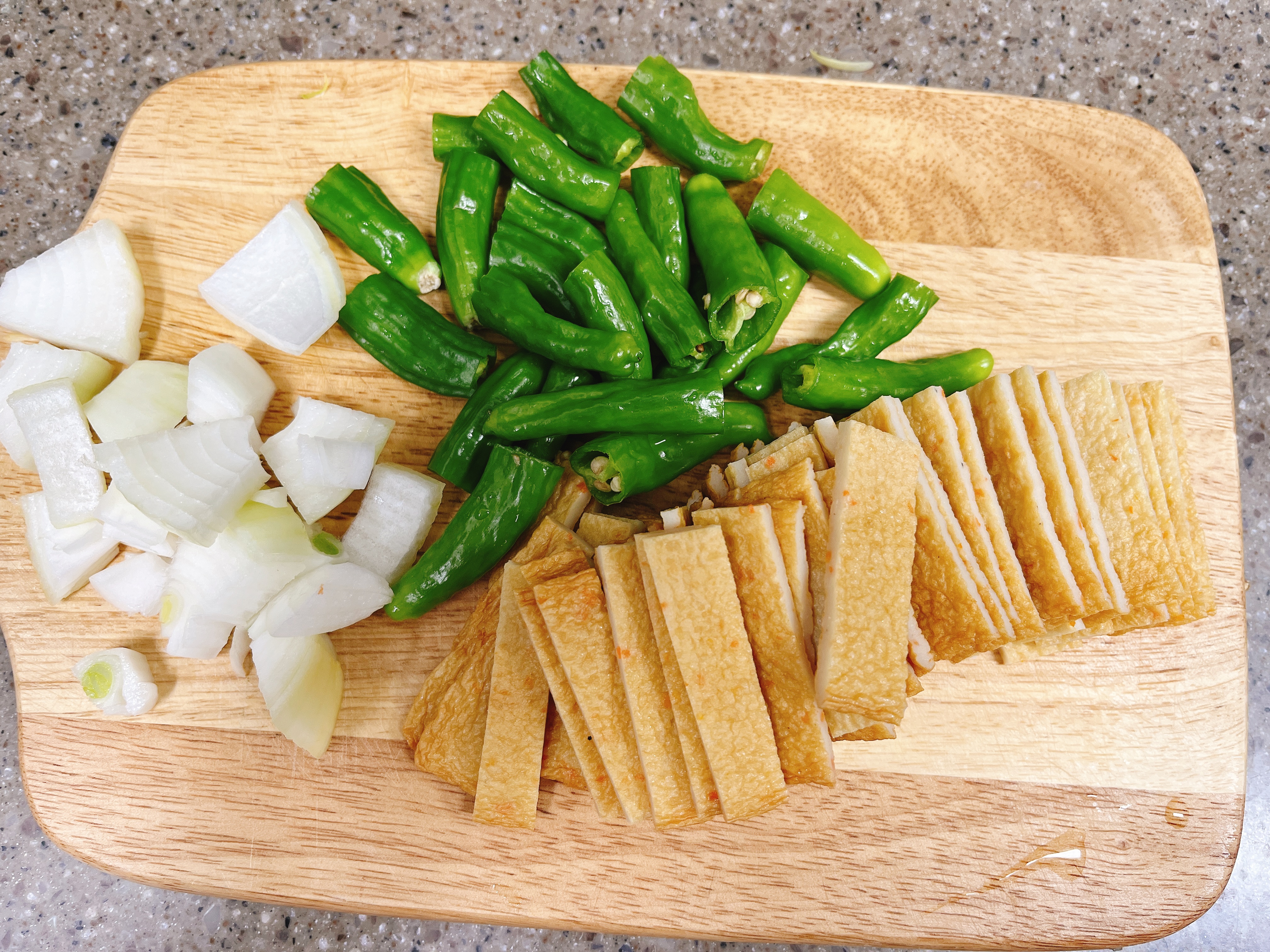 씻어서 꼭지 뗀 꽈리고추 , 양파를 준비해요