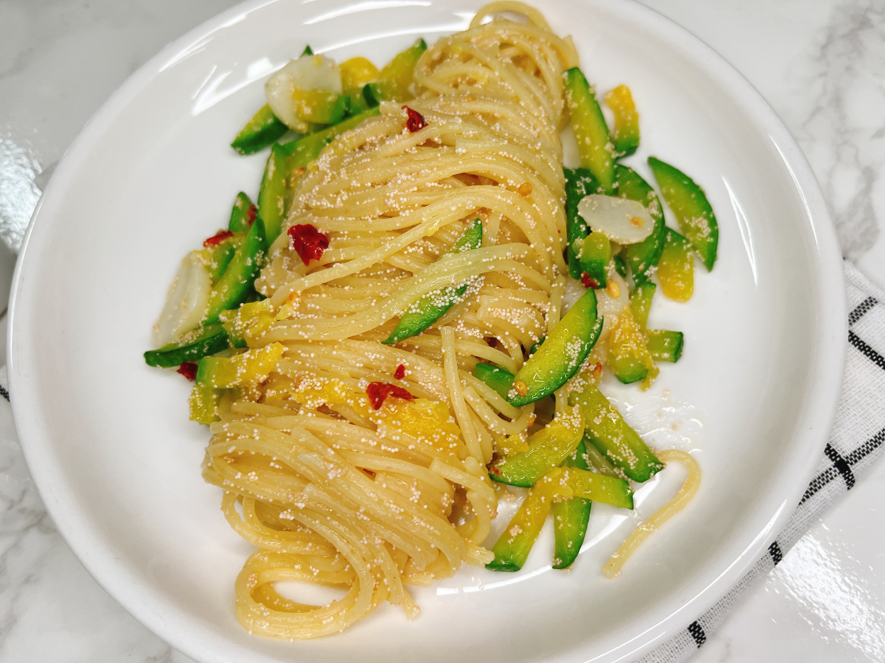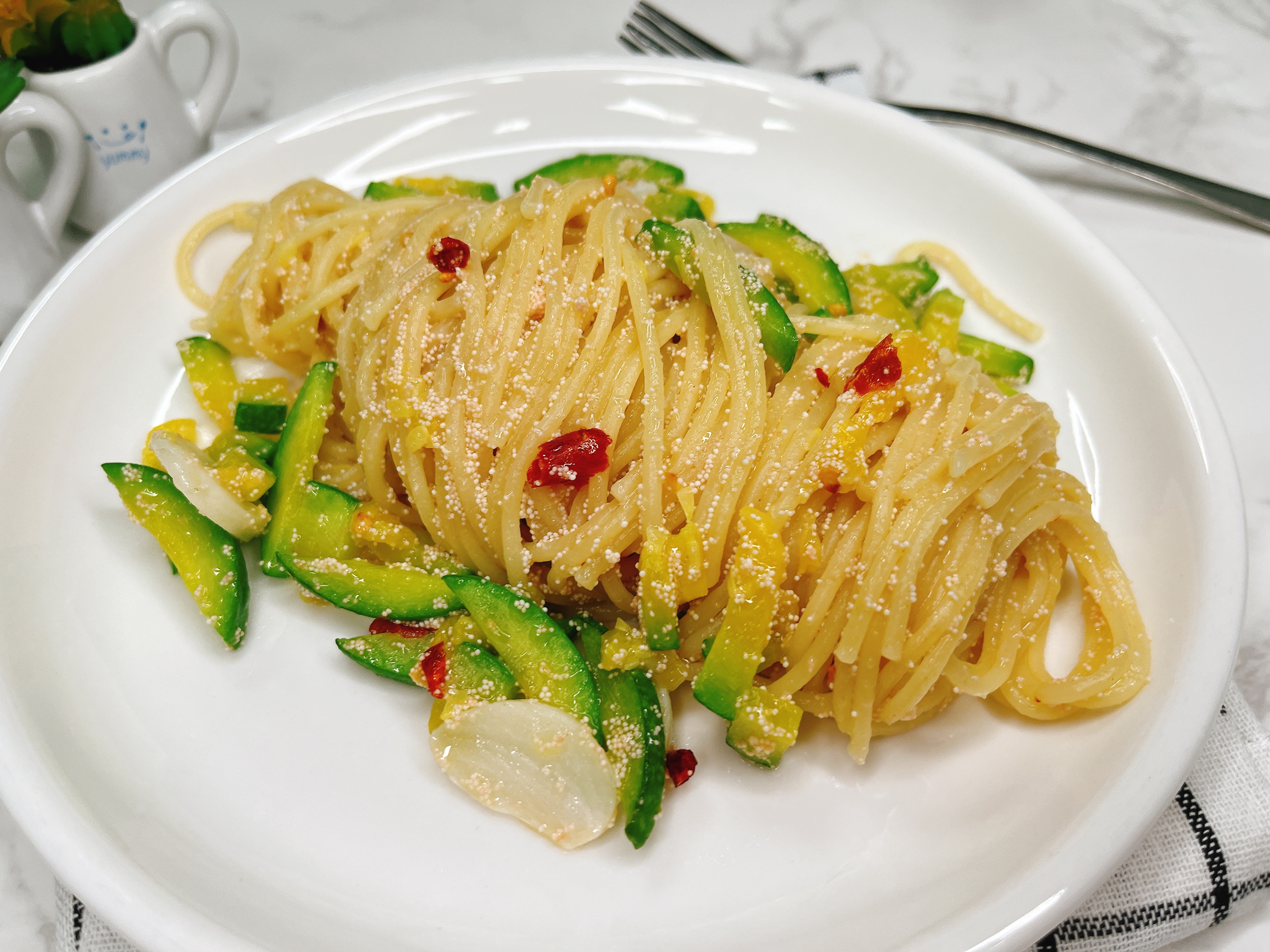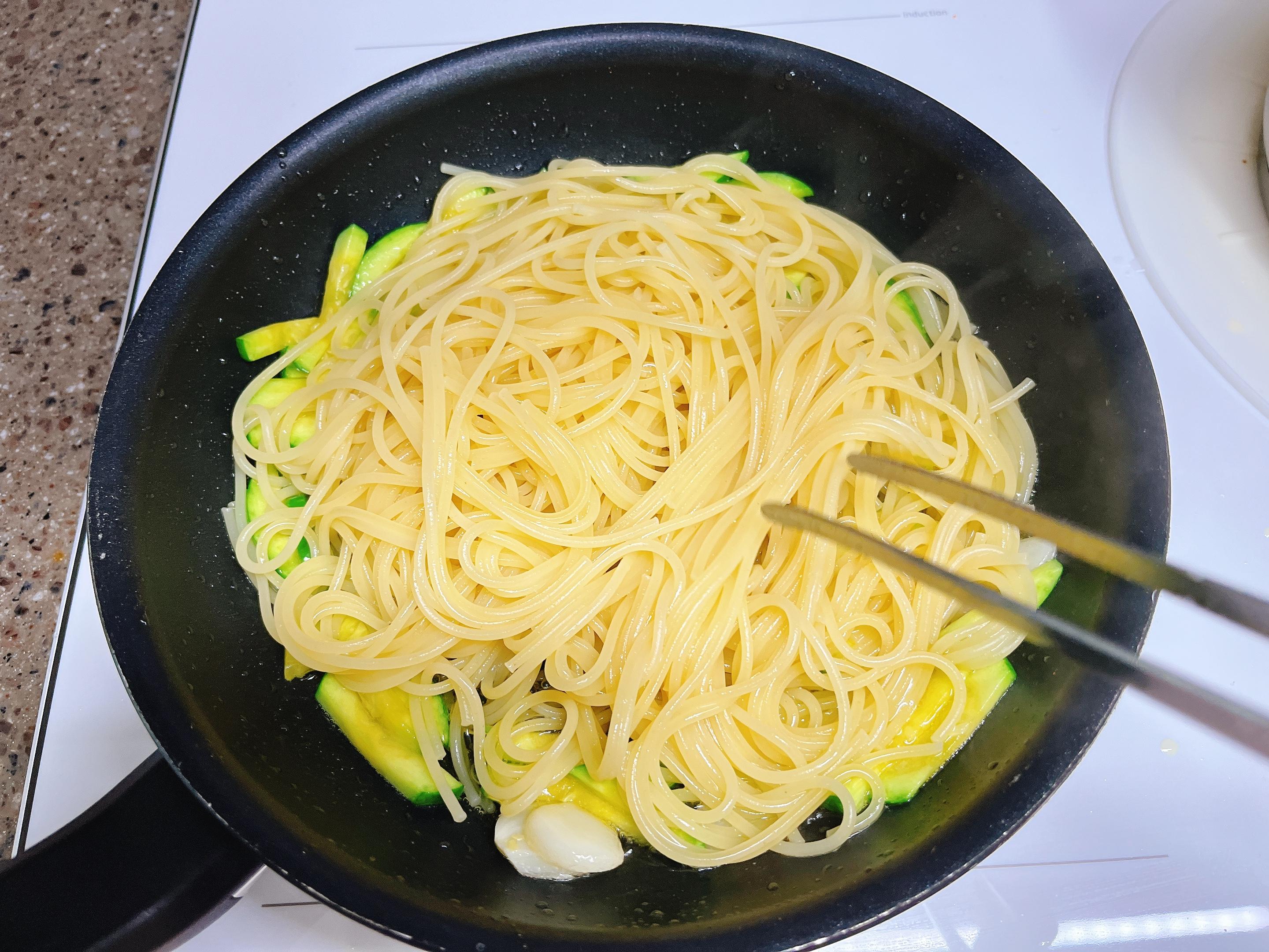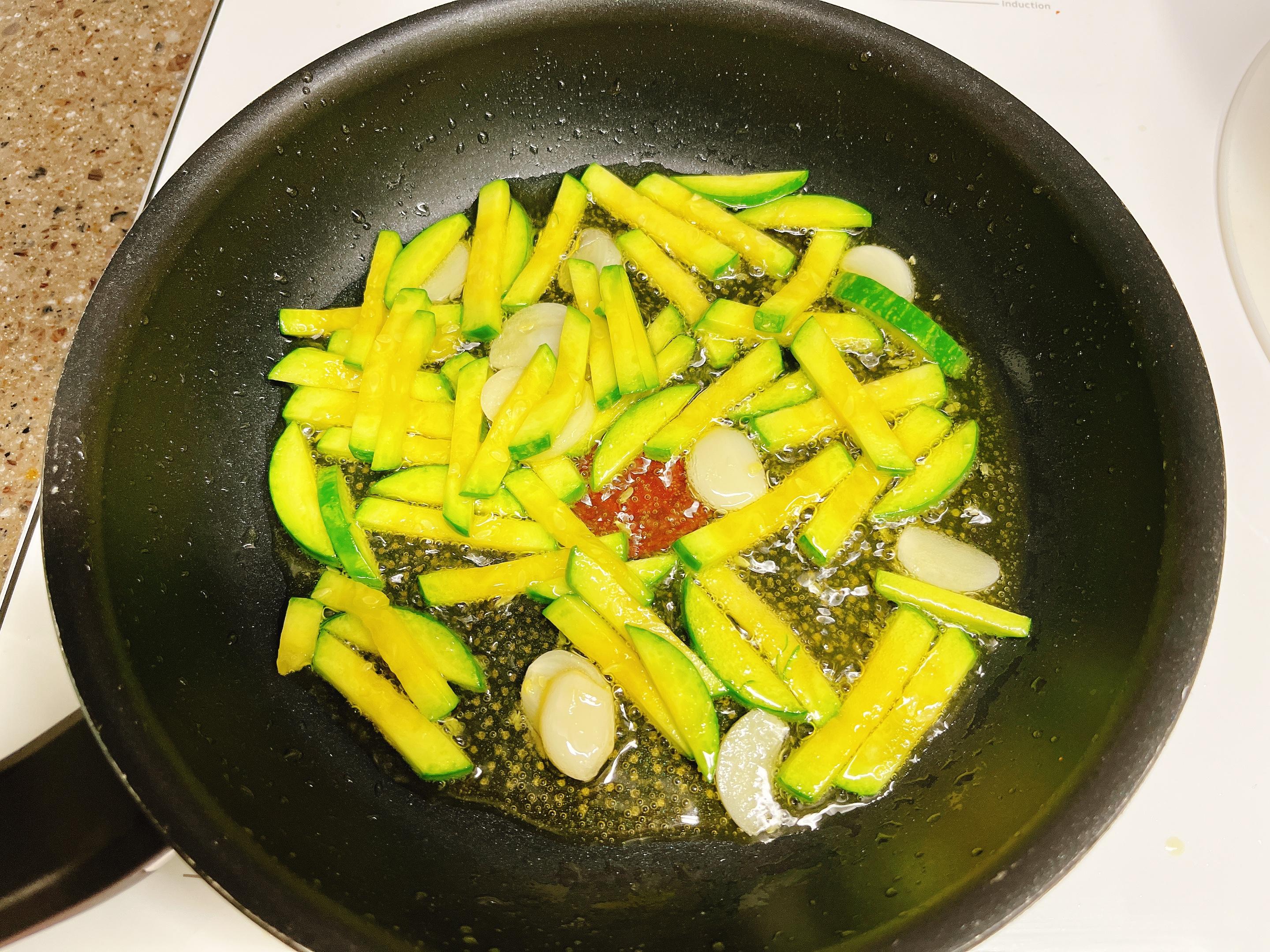 3, 면이 삶아지는 동안 마늘과 애호박을 볶아요