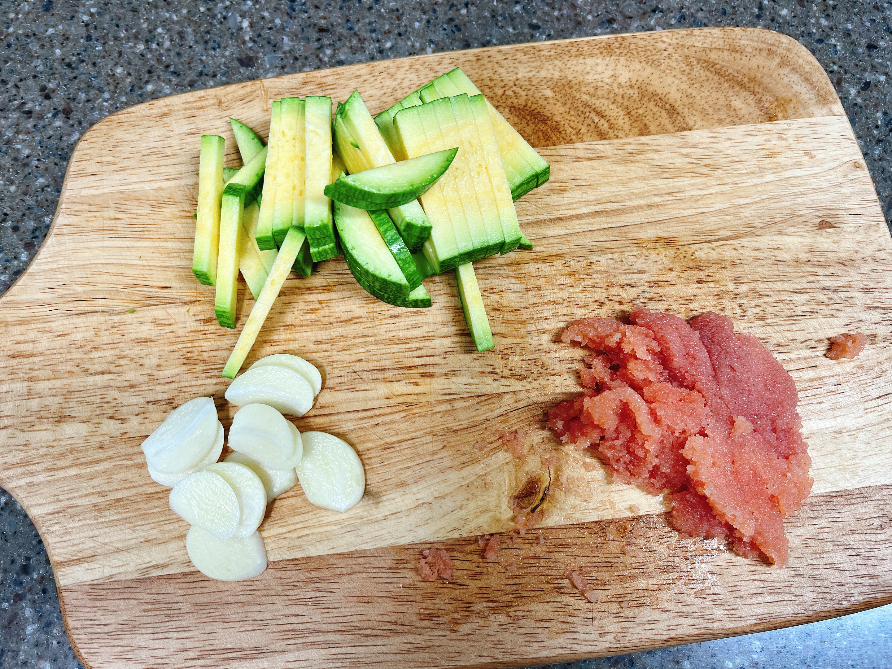 마늘은 편으로 자르고, 애호박은 채썰고,