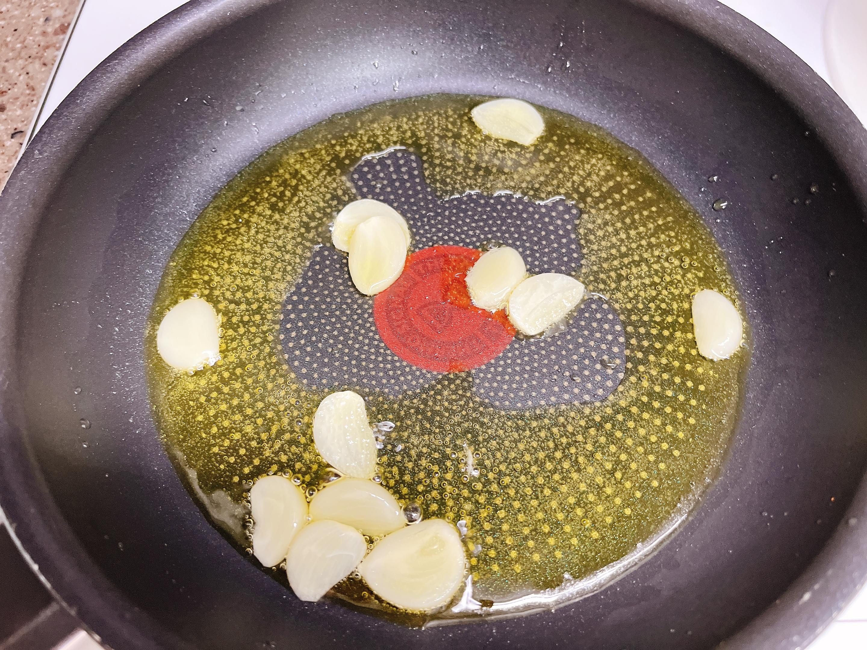 편으로 썰어둔 마늘도 더해 중불로 가열해요