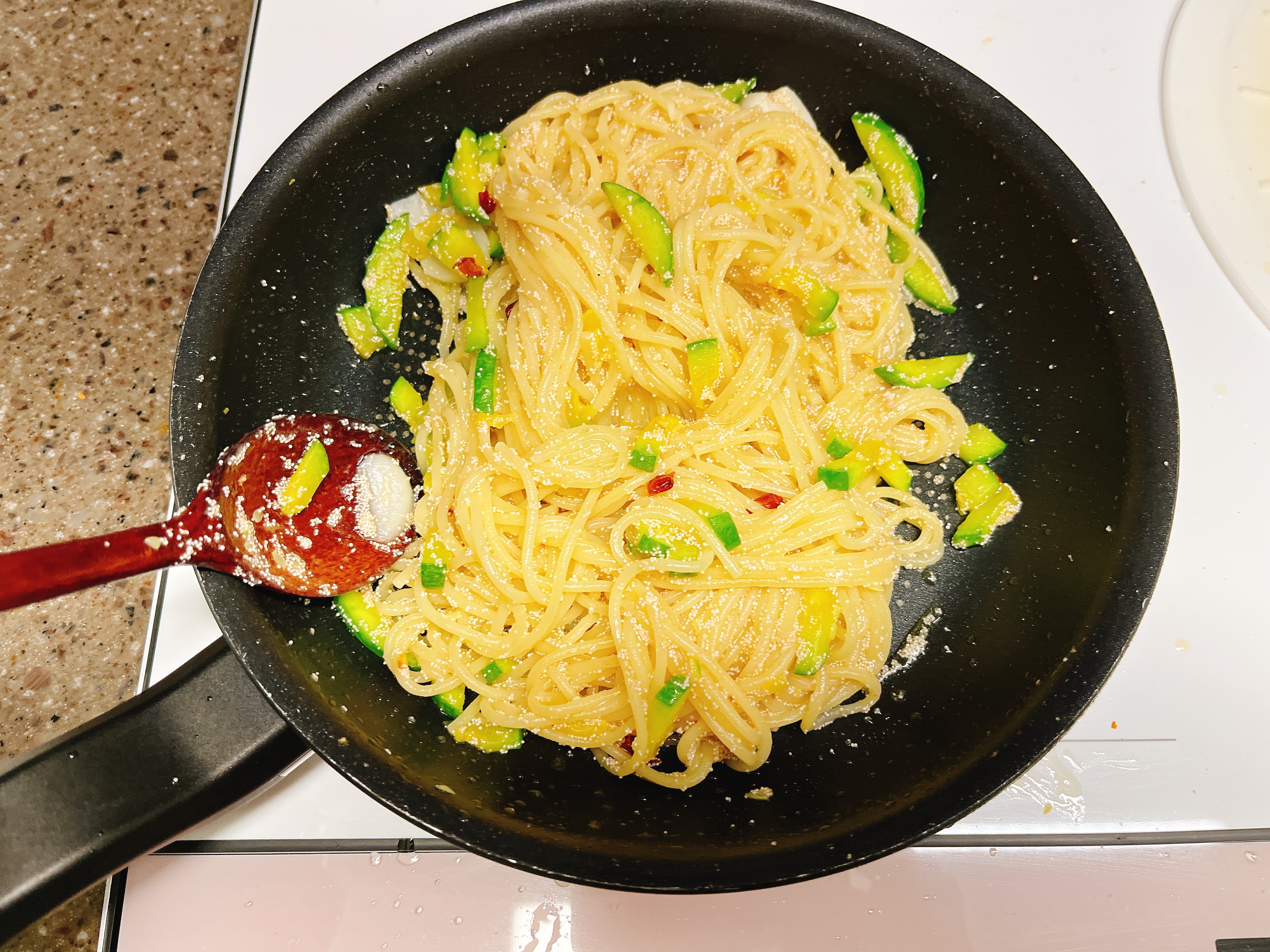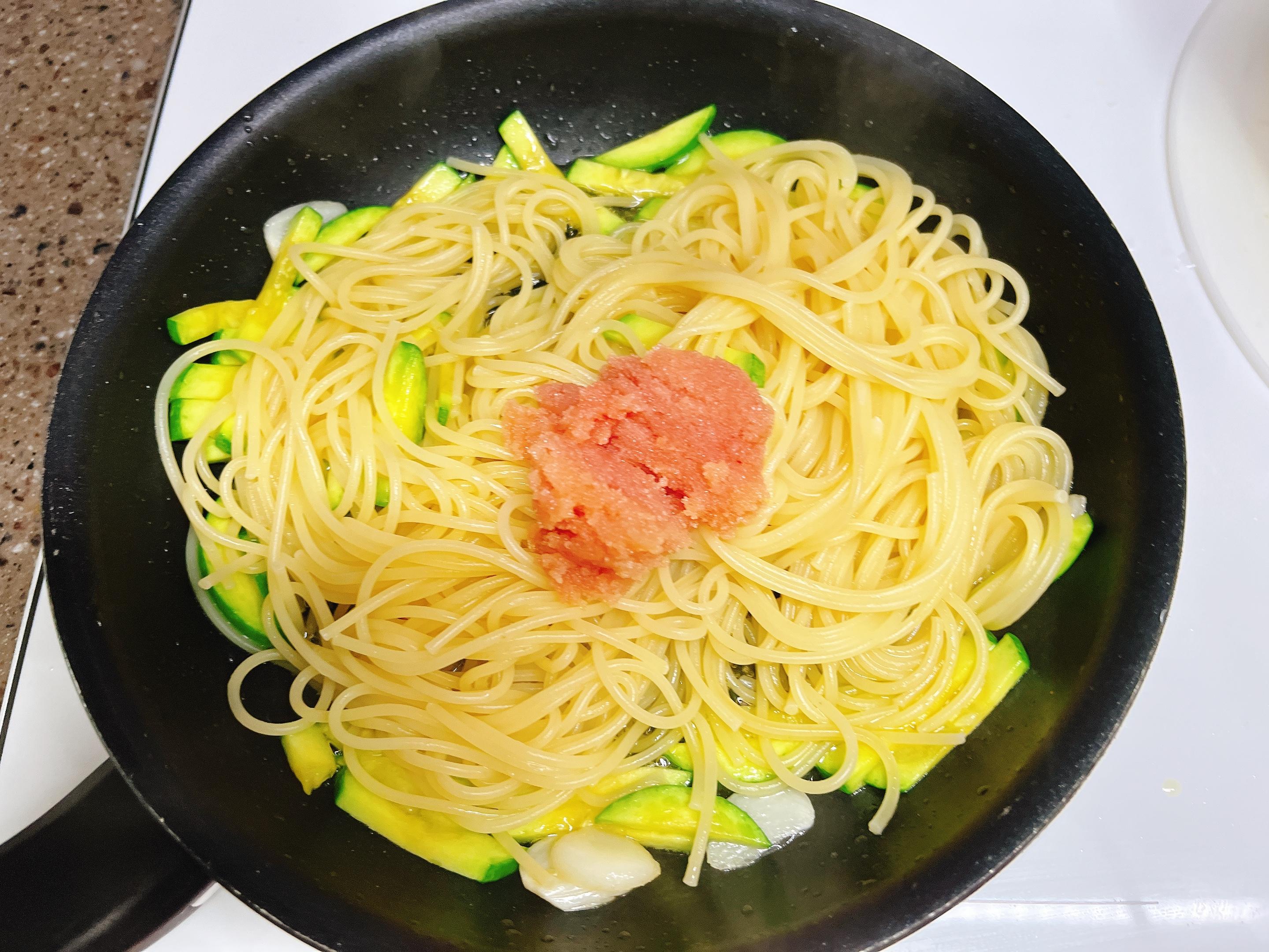 4. 삶은 면, 명란을 애호박팬에 넣고 볶아요