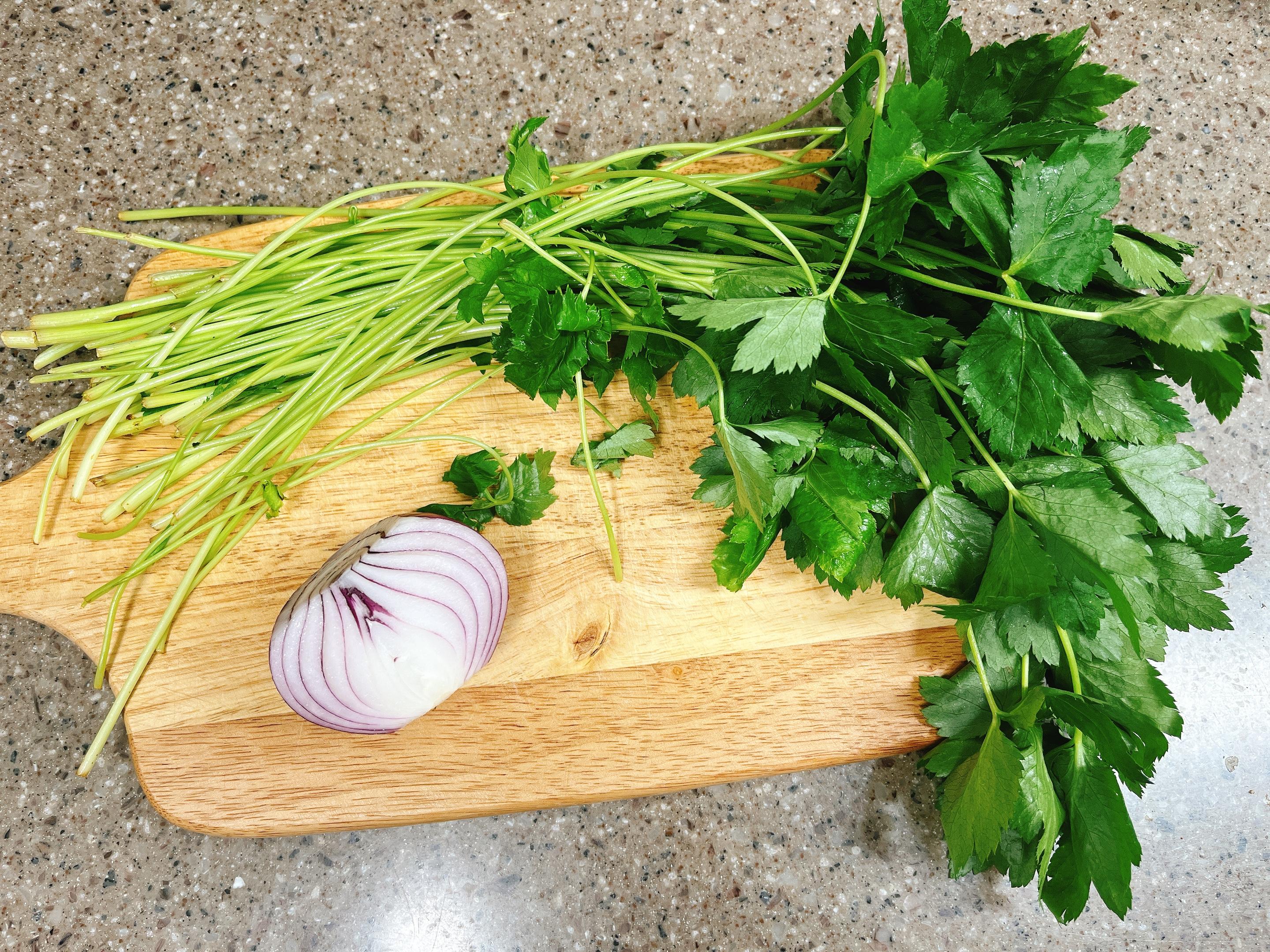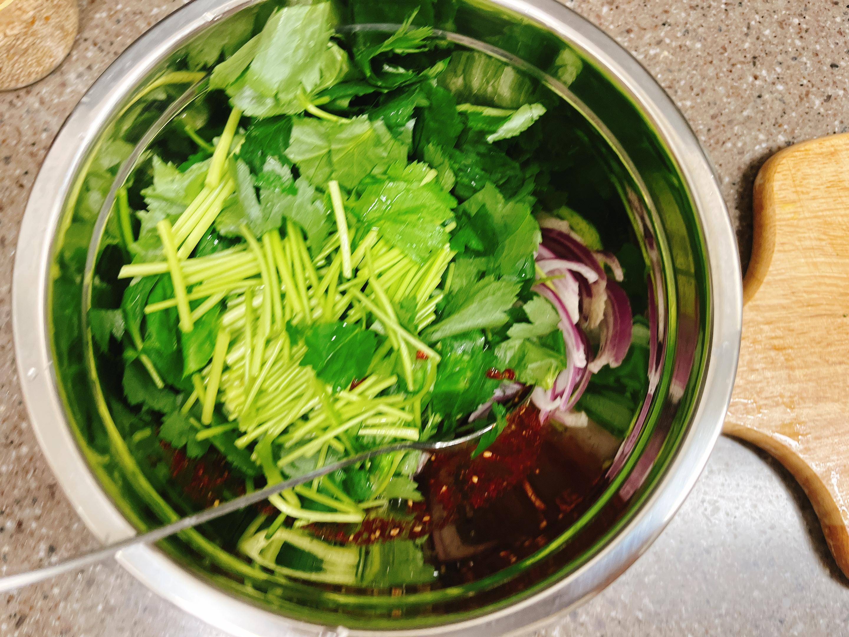 썰어둔 참나물과 양파를 담아 ~