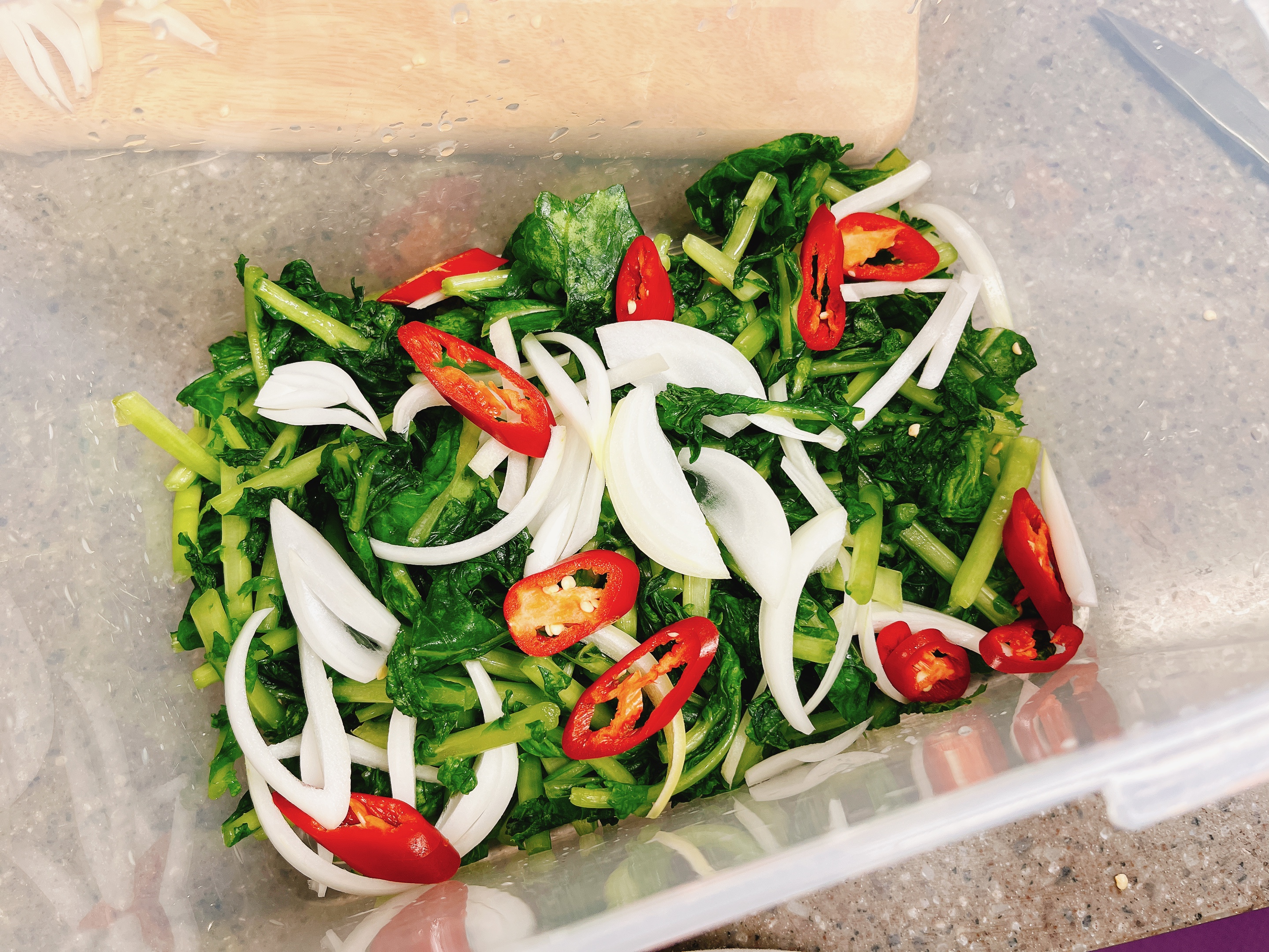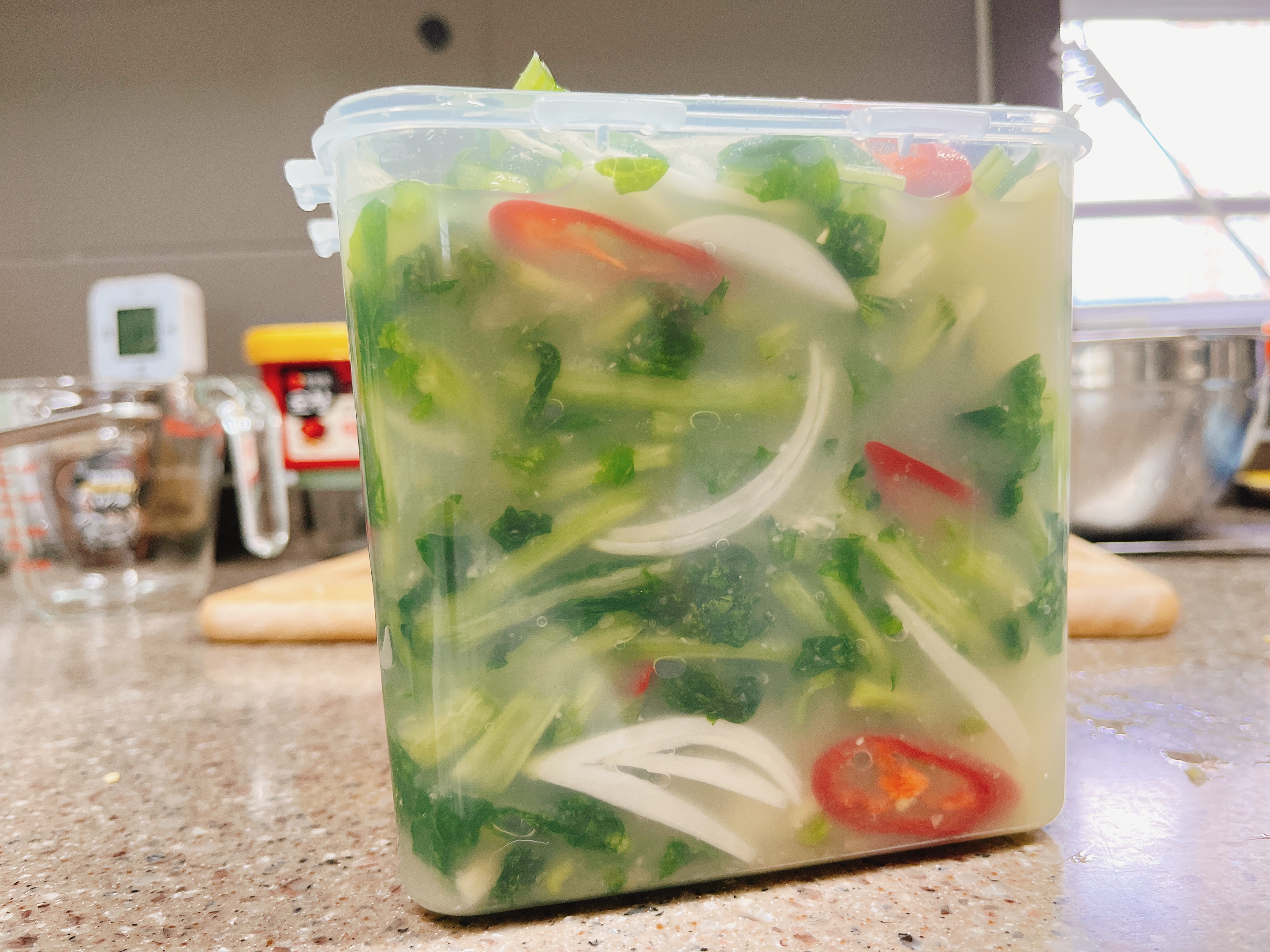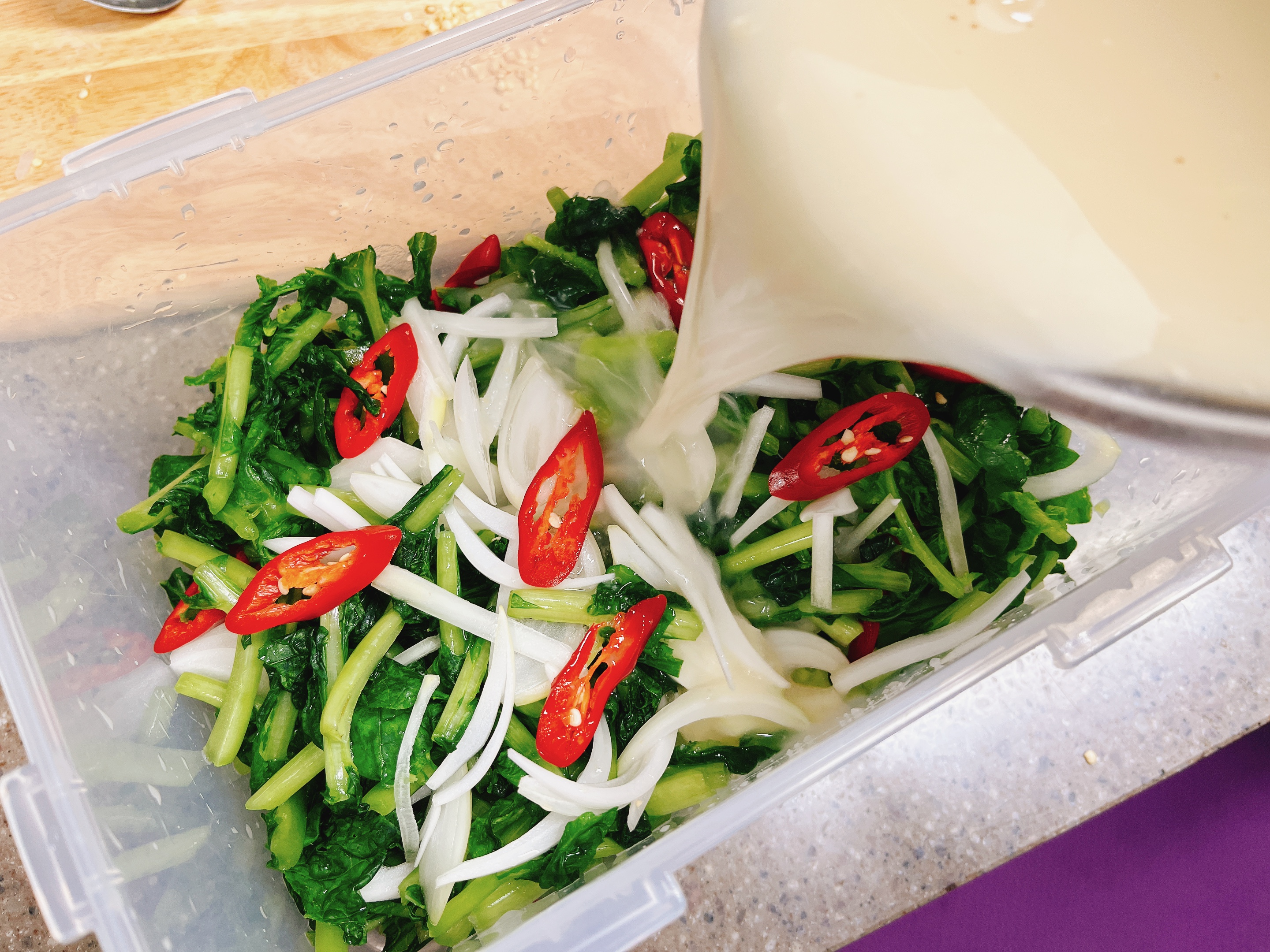 통에 절여둔 열무를 깔고