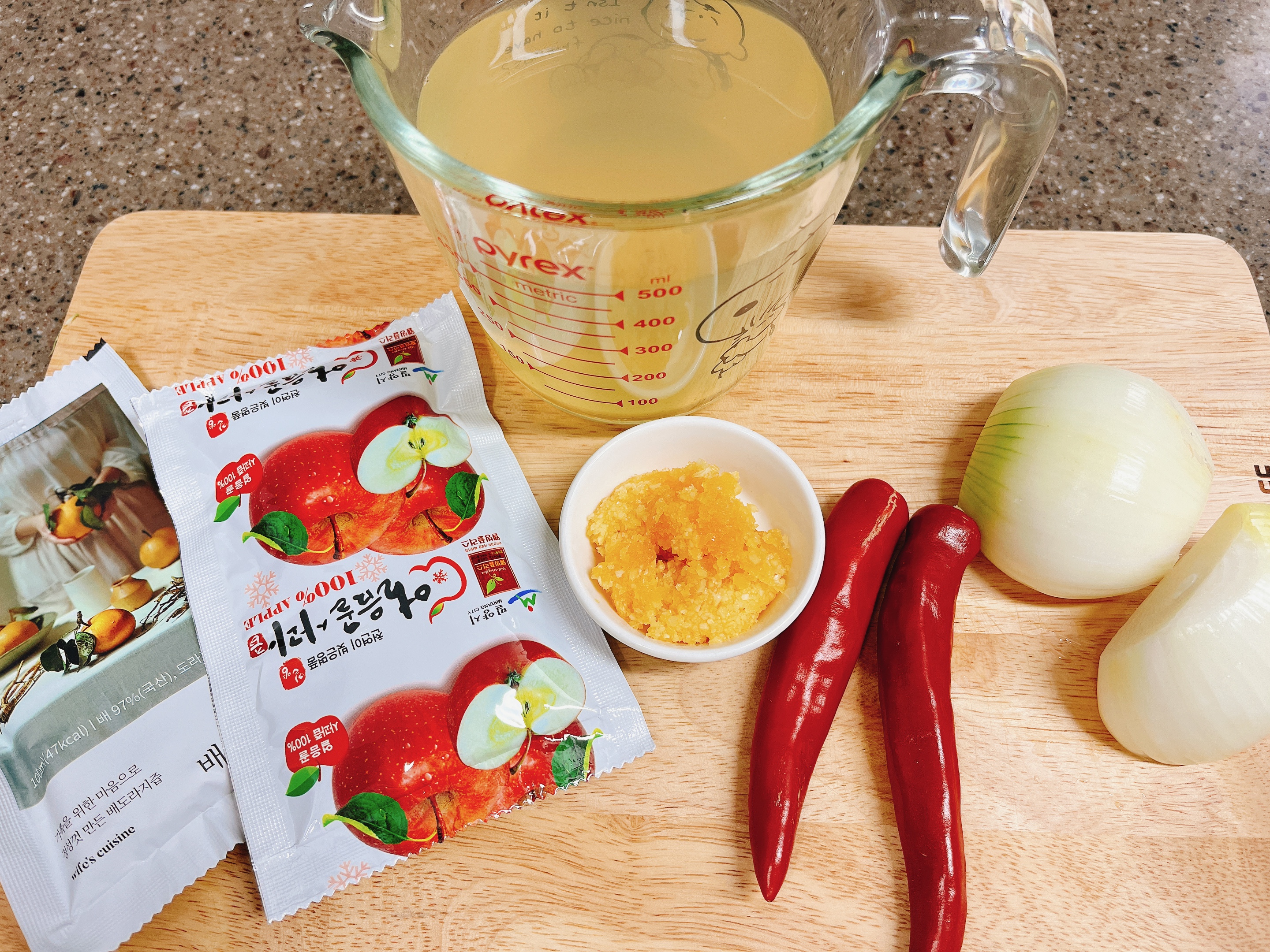 멸치다시마 육수, 배즙, 사과즙 , 양파, 홍고추, 다진마늘