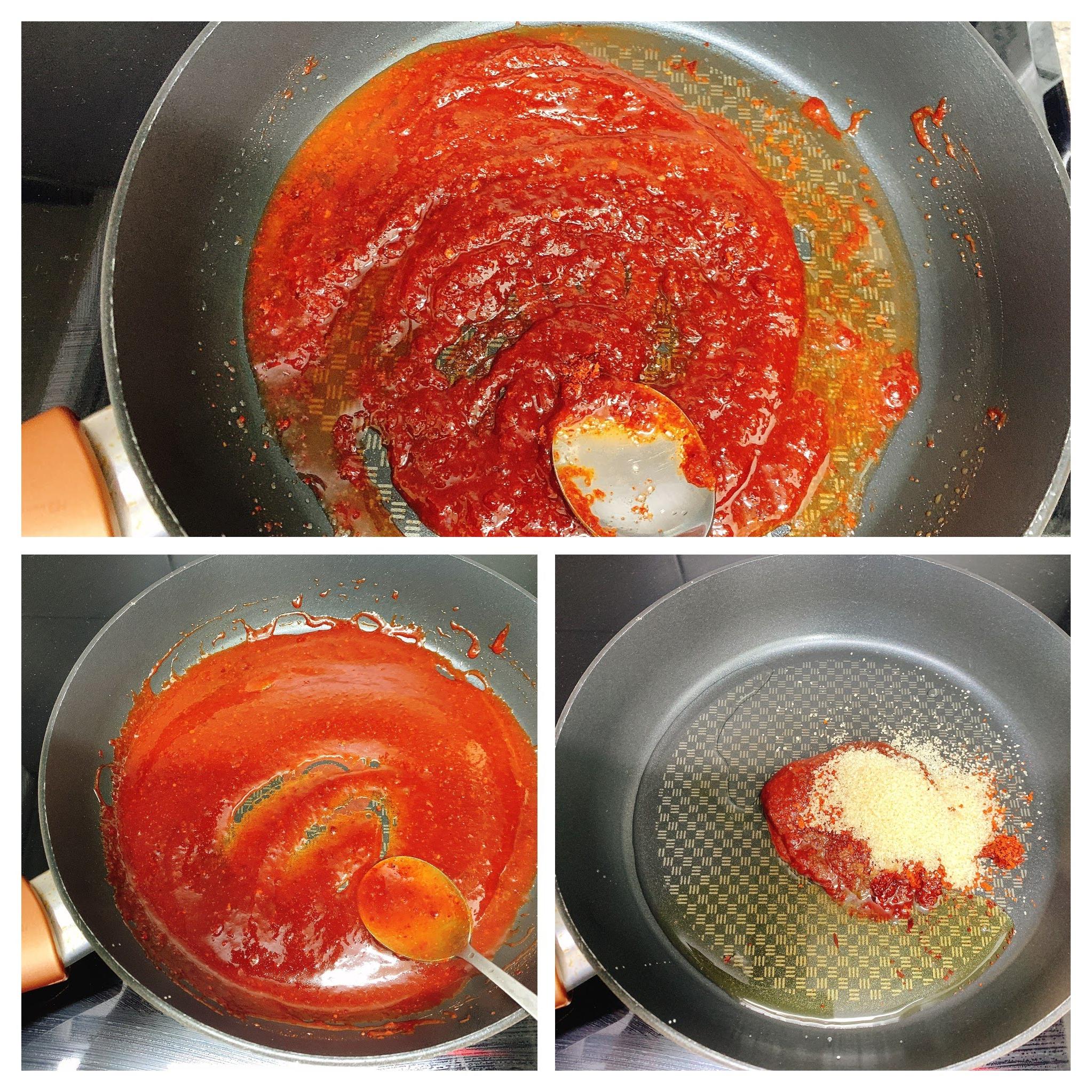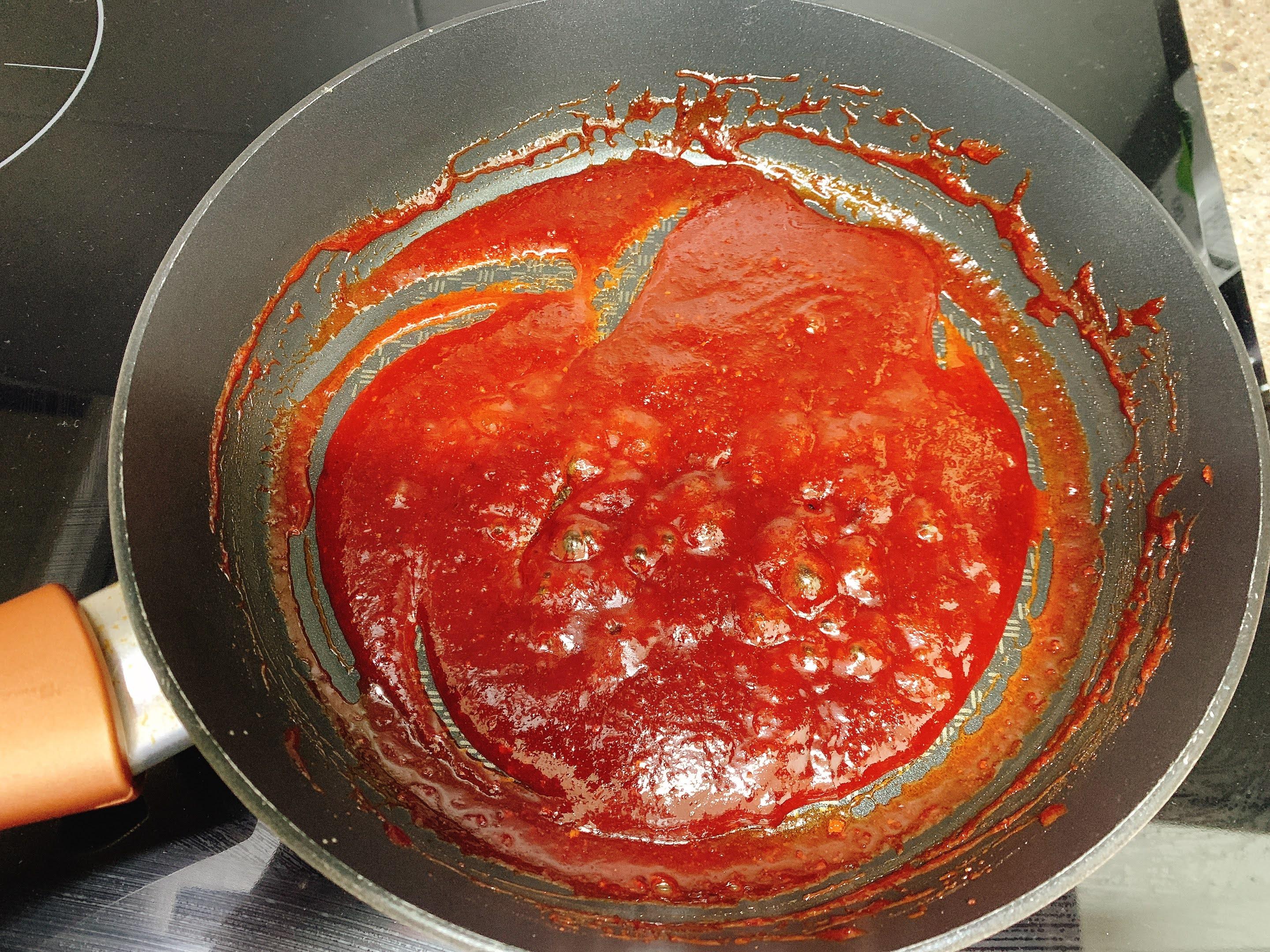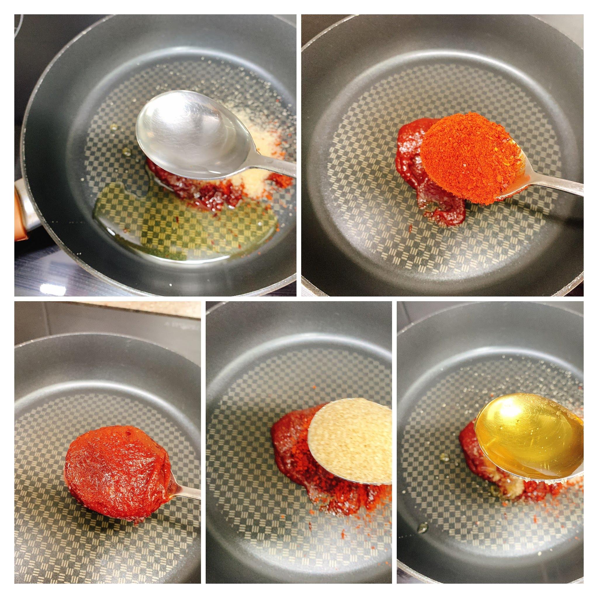 후라이팬에 고추장, 고추가루, 설탕, 물엿, 물을