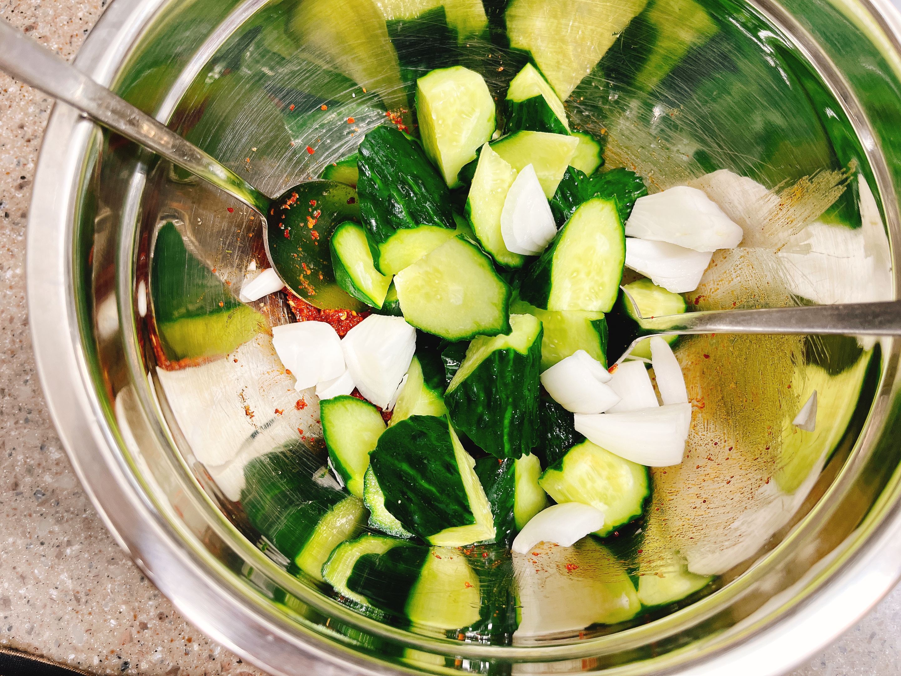 썰어둔 오이와 양파를 넣고