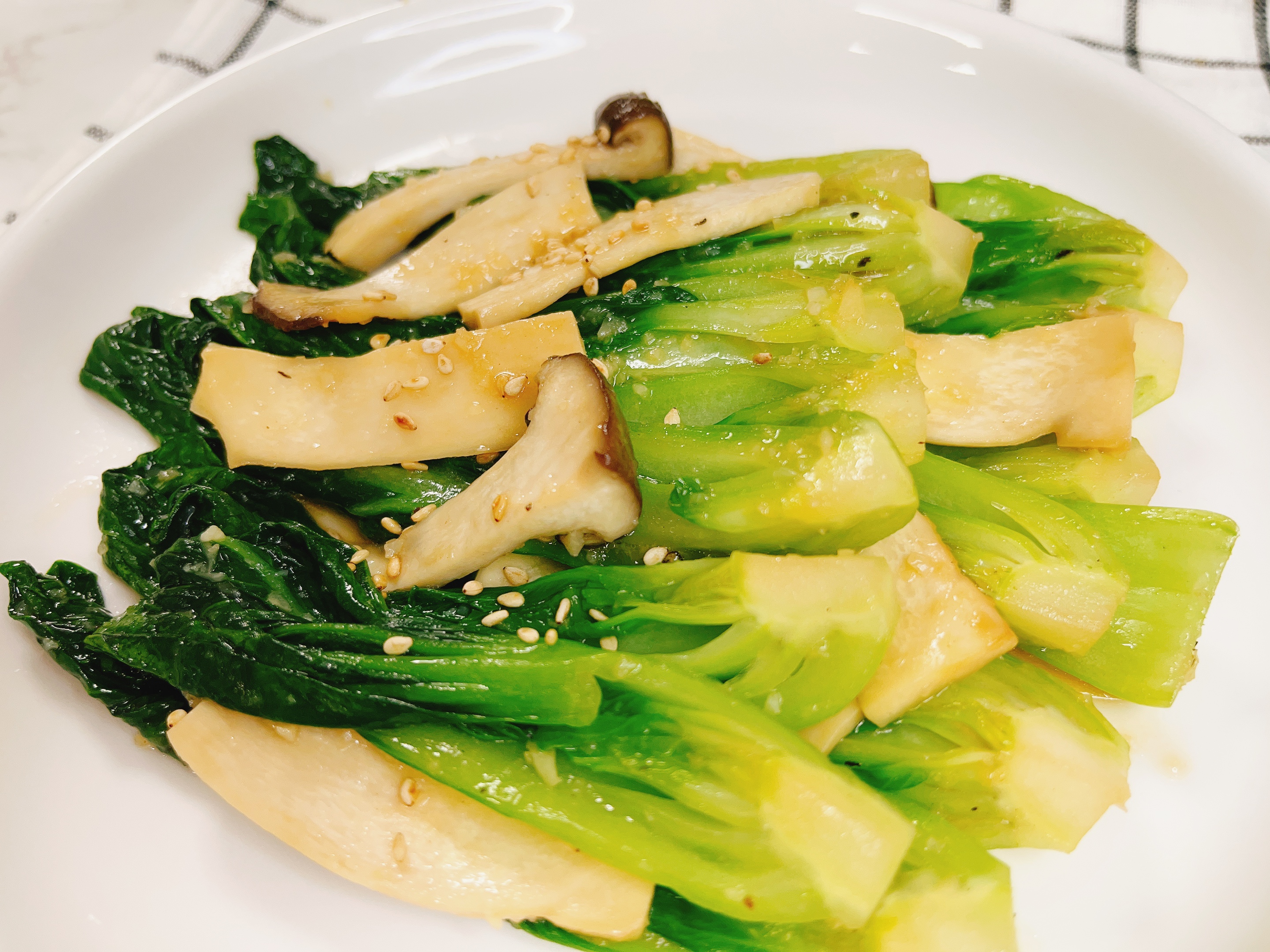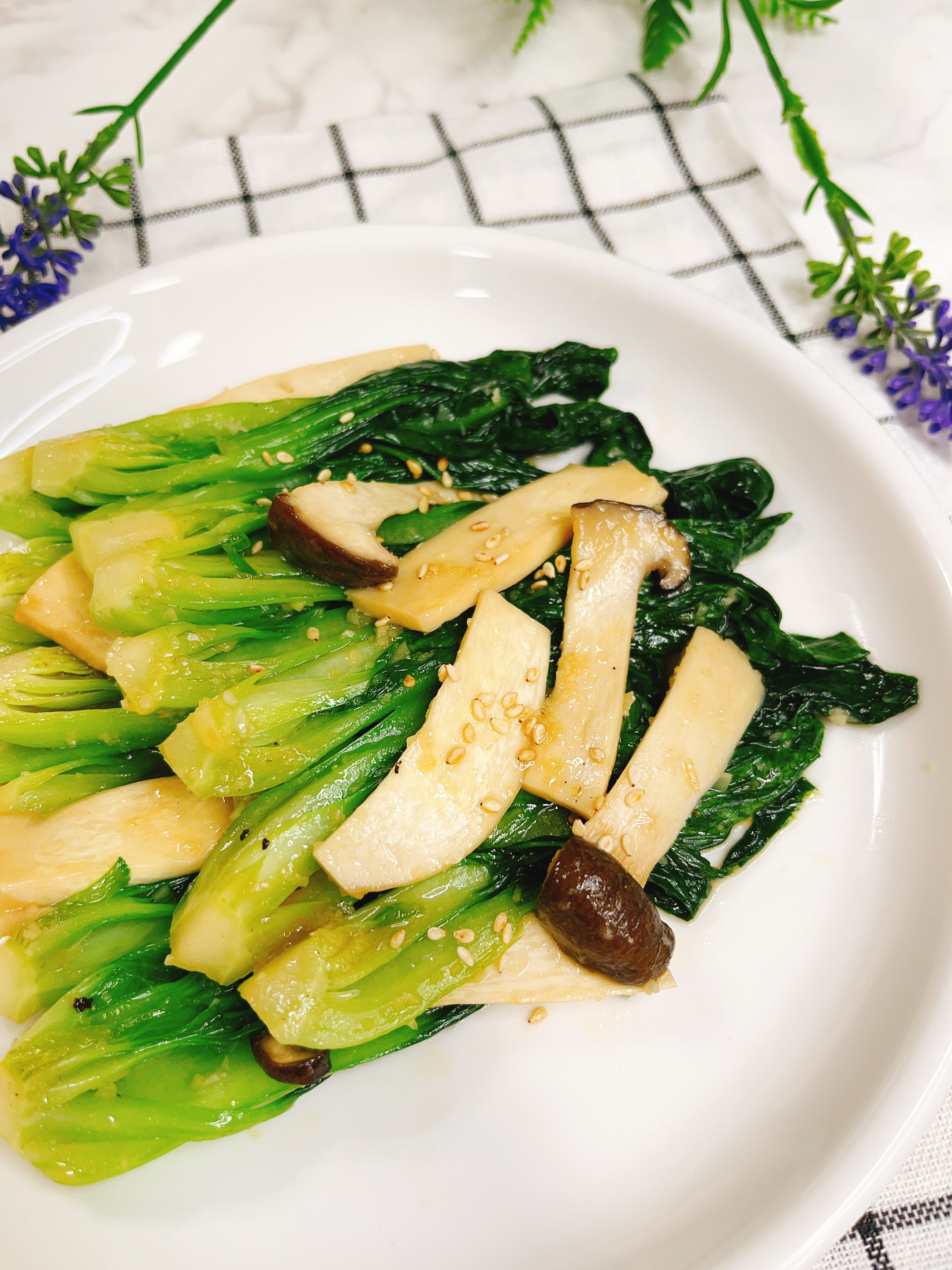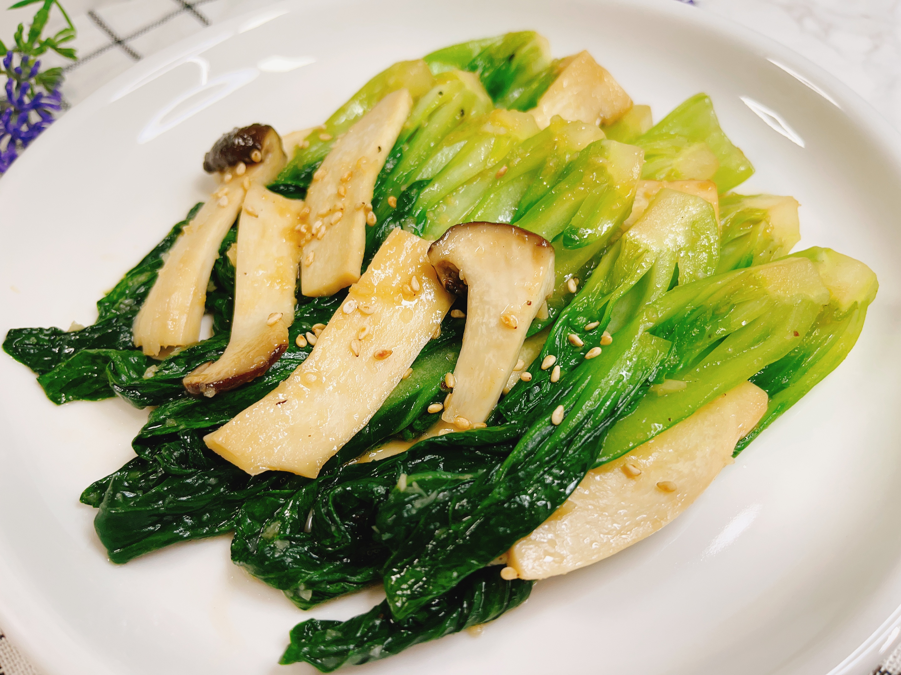 데친 청경채, 새송이버섯을 넣고