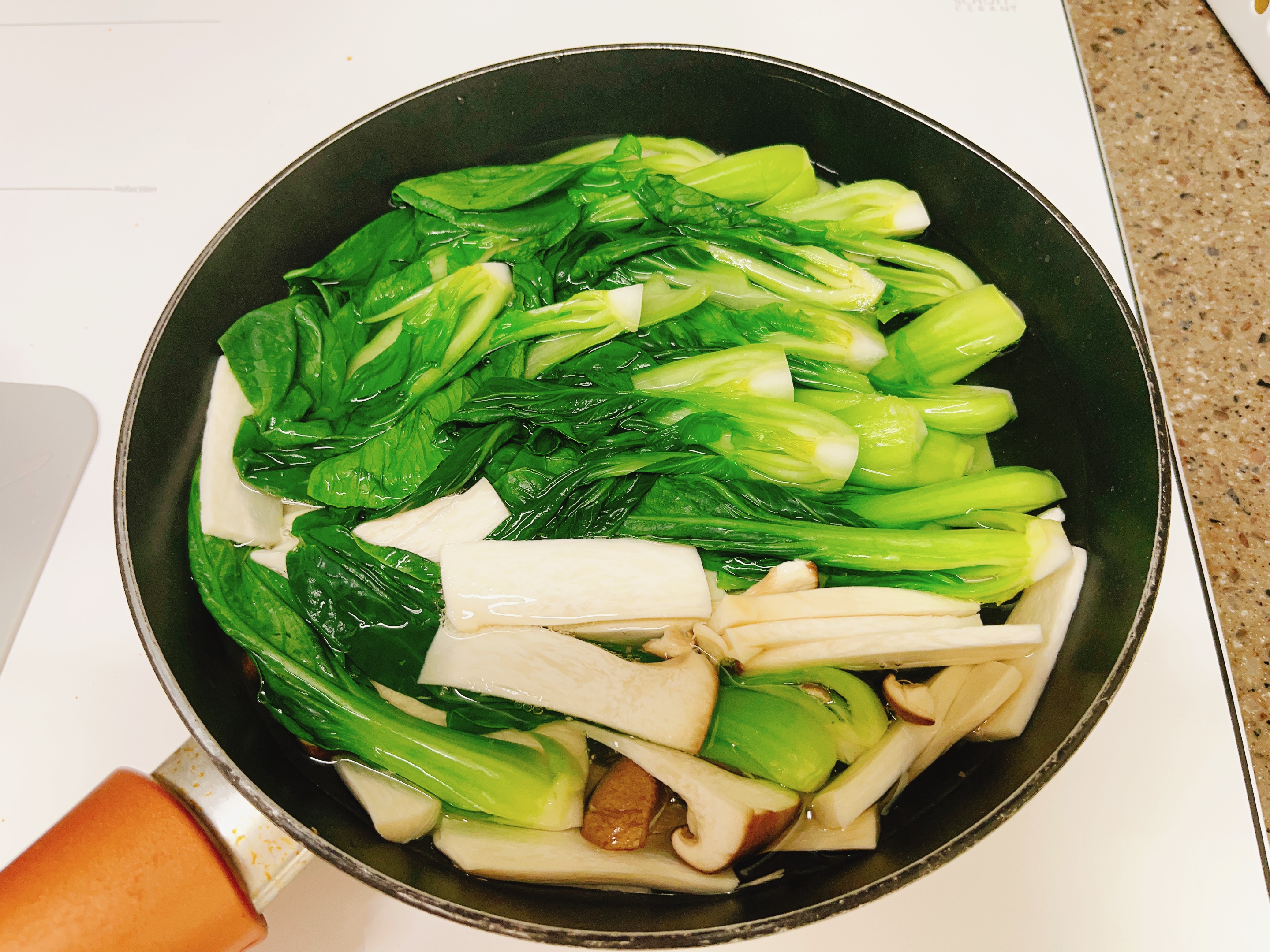청경채, 새송이버섯을 넣어 짧게 데쳐요