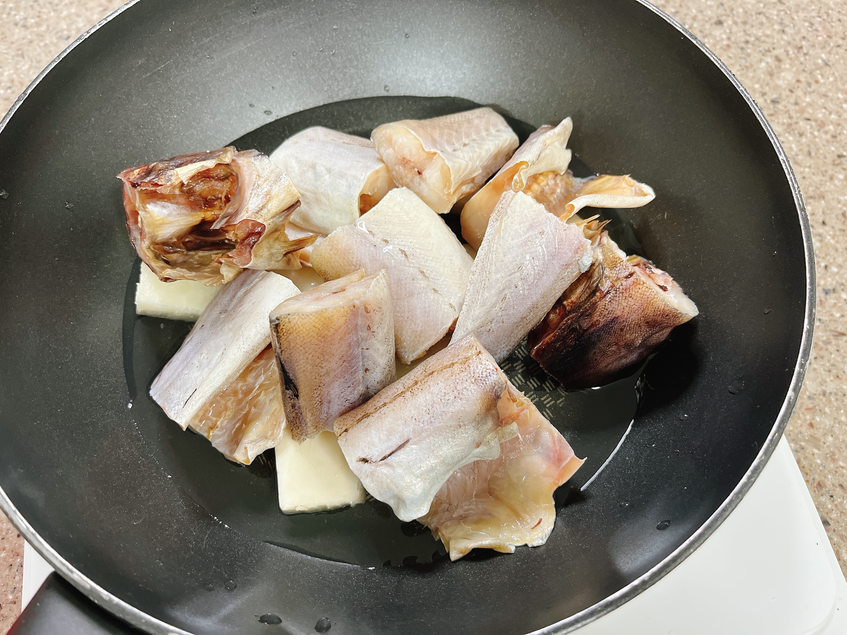 깊은 코팅팬에 코다리와 무를 담고,