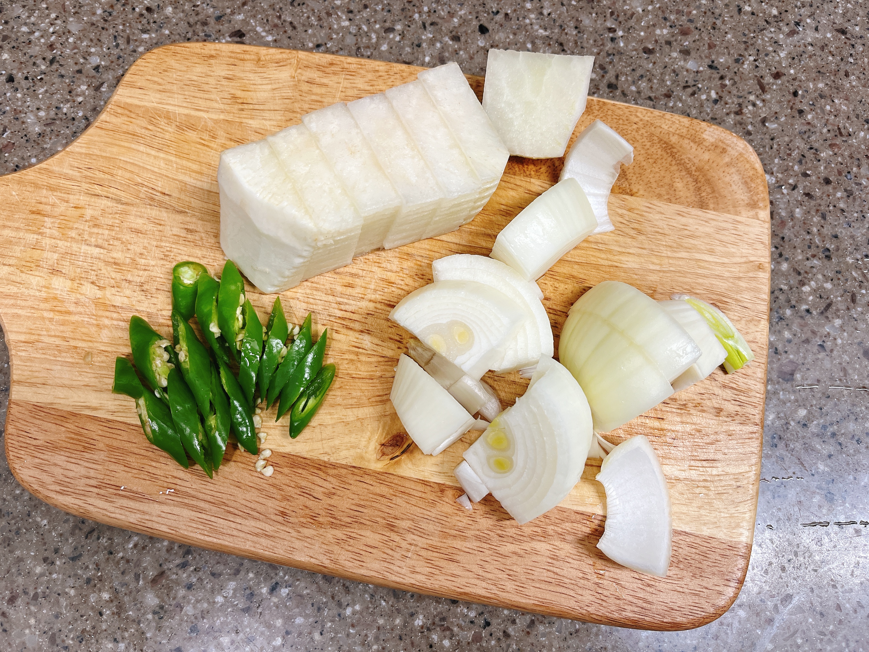 무 작은 1토막, 양파 1/2개, 청양고추 2개