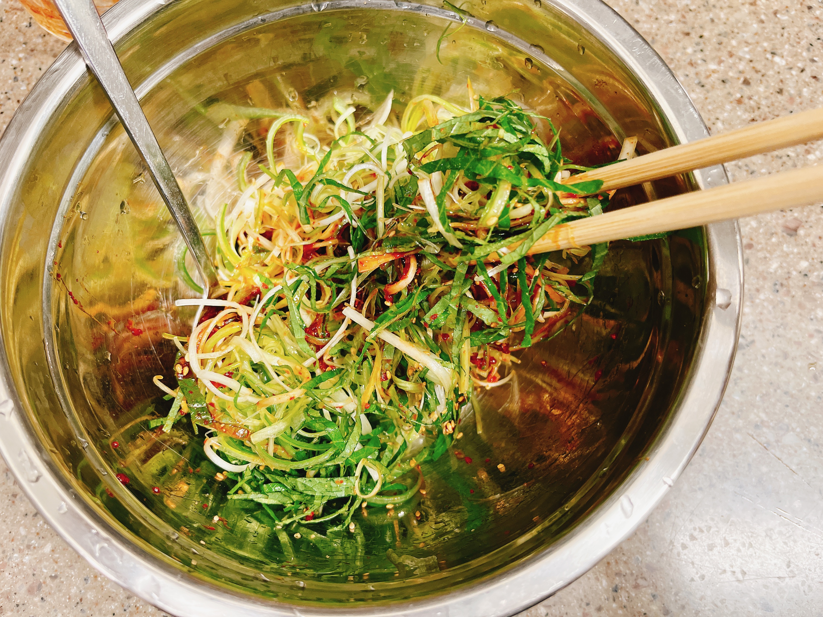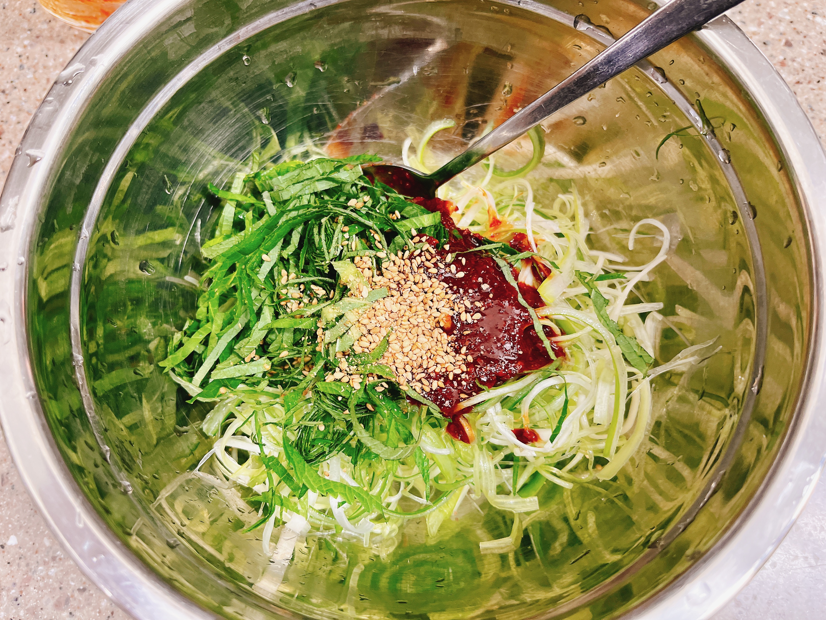 양념을 넣고~ 깨소금을 더해서