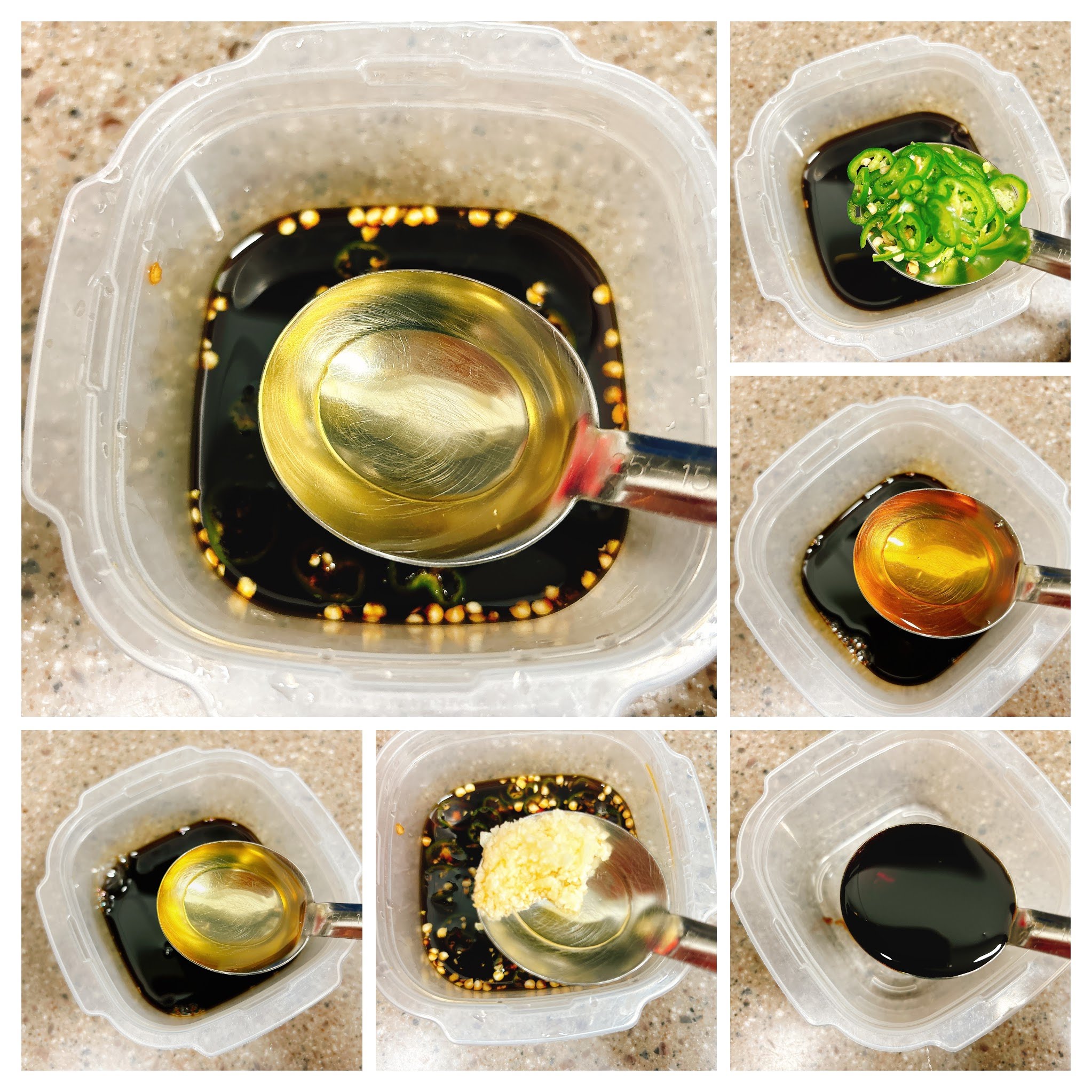 간장 2스푼, 식초 2스푼, 간장 2스푼, 물 2스푼